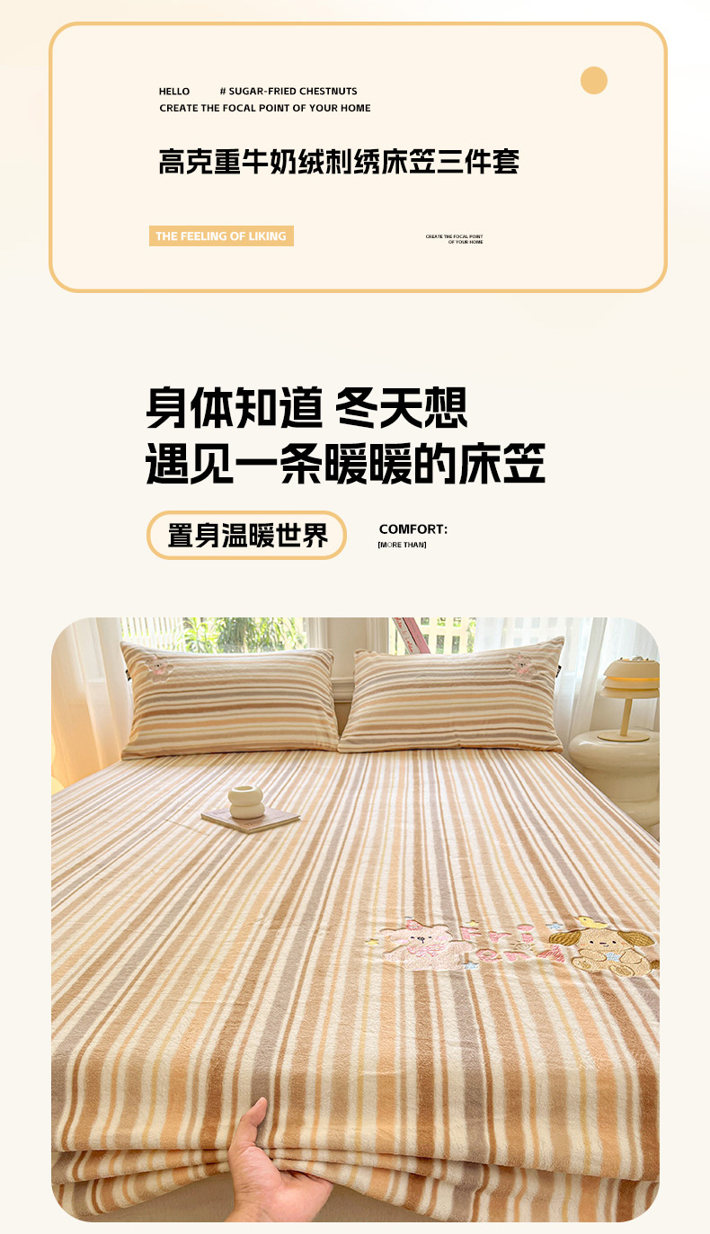 商品名称:乐美家纺 2025新款A类高克重刺绣牛奶绒床笠三件套 小熊奶盖