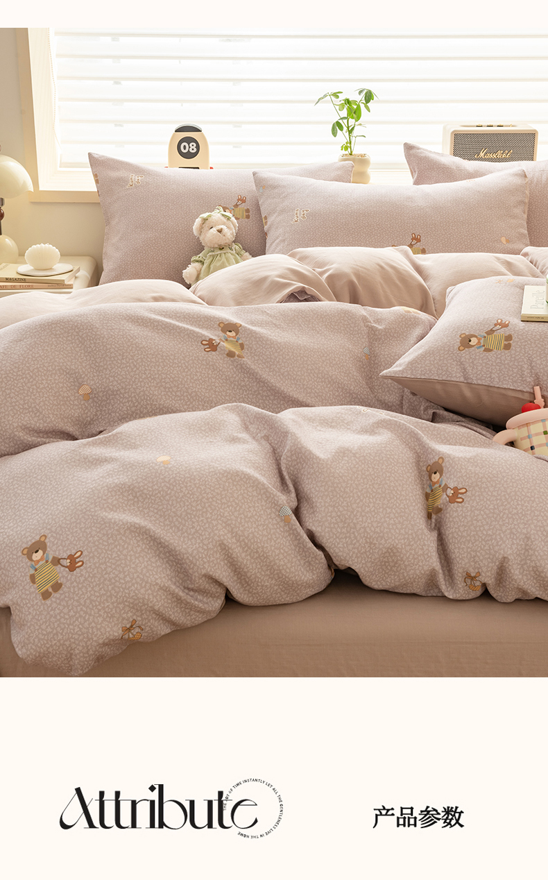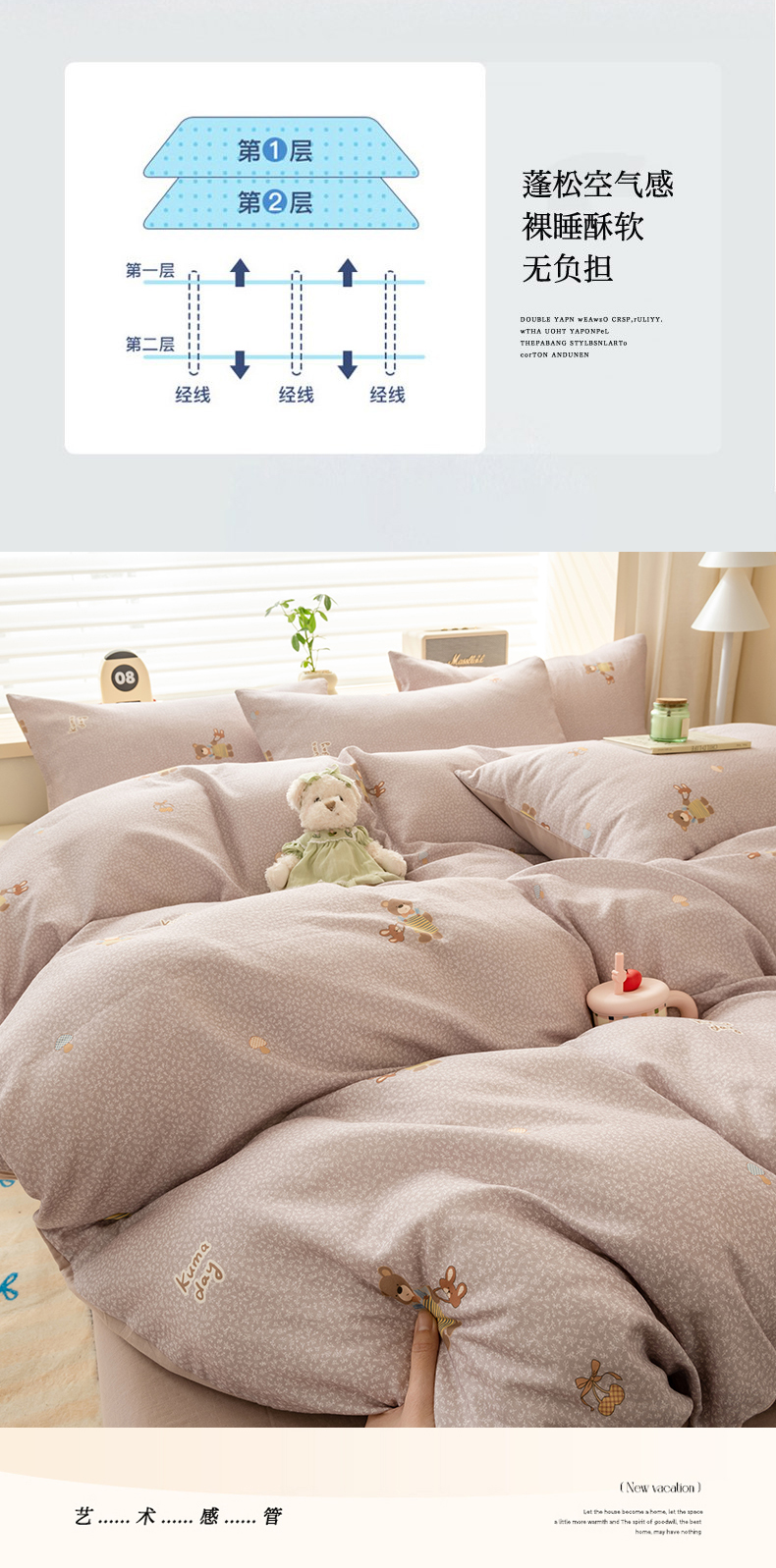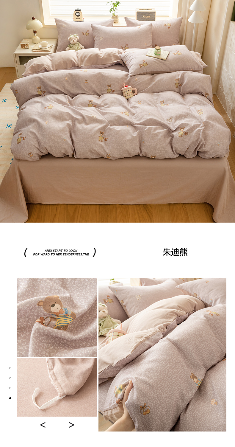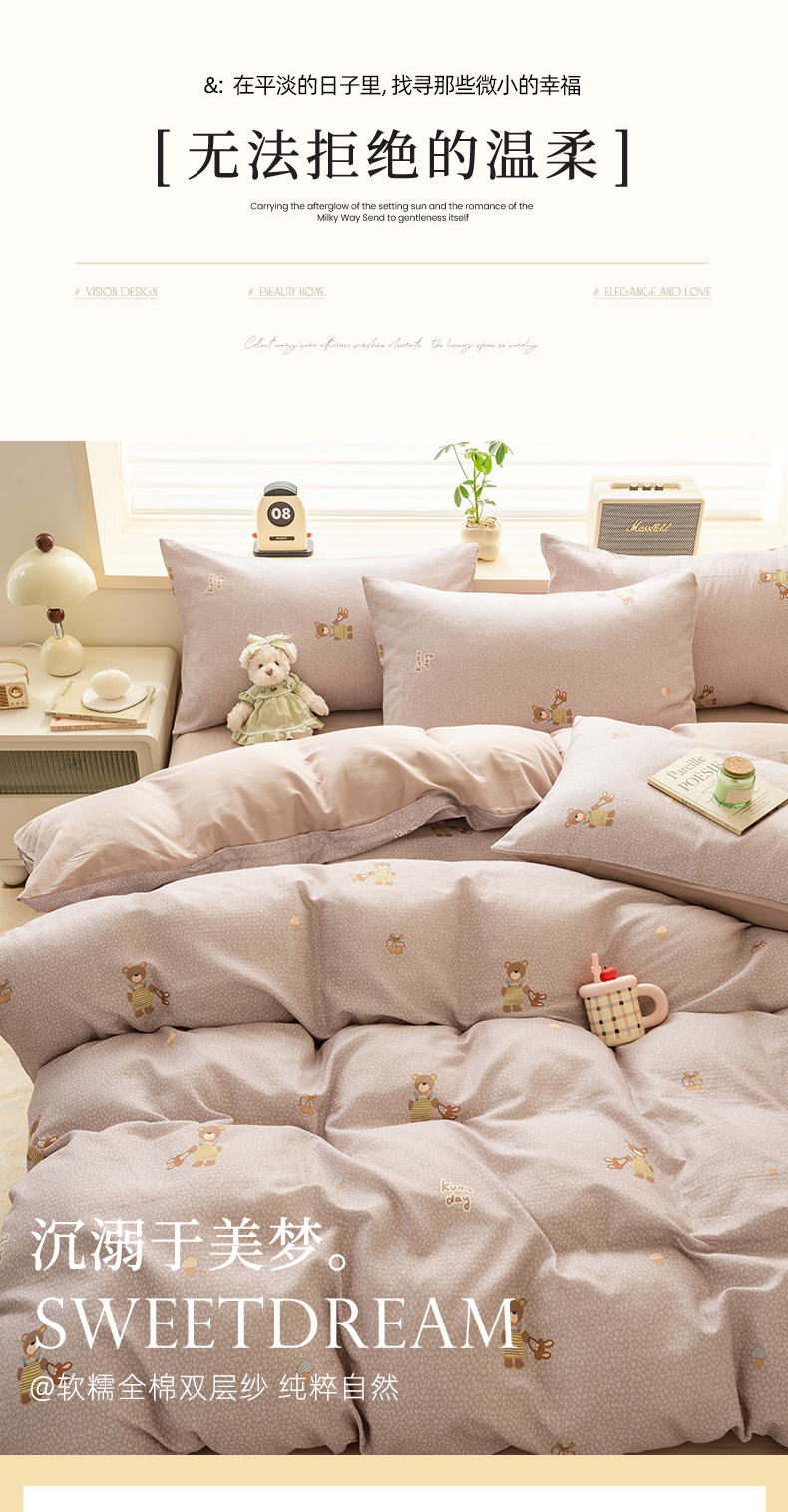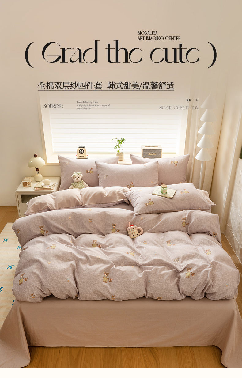 商品名称:雯雨家纺 2026春夏新款A类全棉有氧双层纱印花简约款四件套 朱迪熊