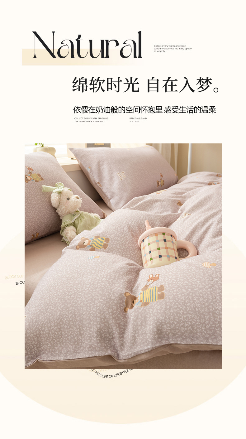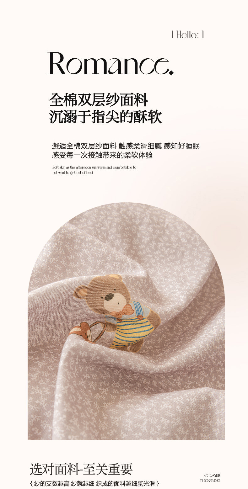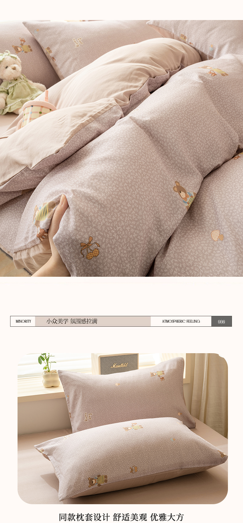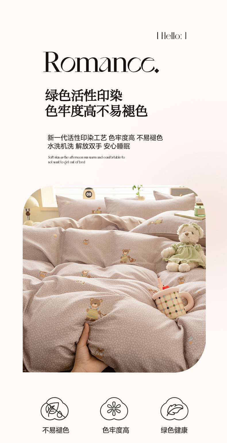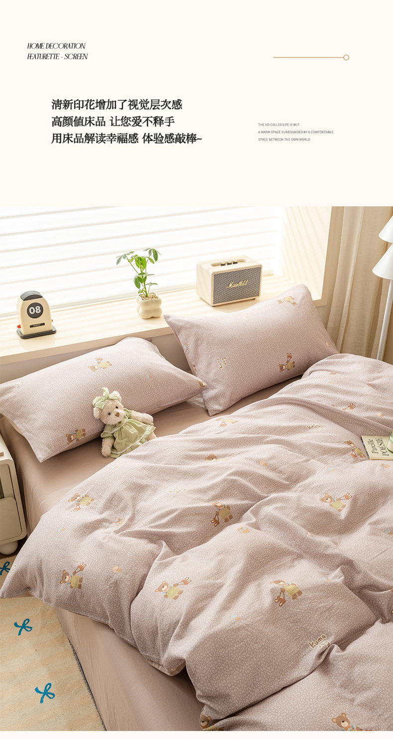 商品名称:雯雨家纺 2026春夏新款A类全棉有氧双层纱印花简约款四件套 朱迪熊
