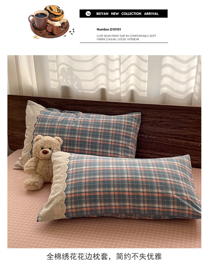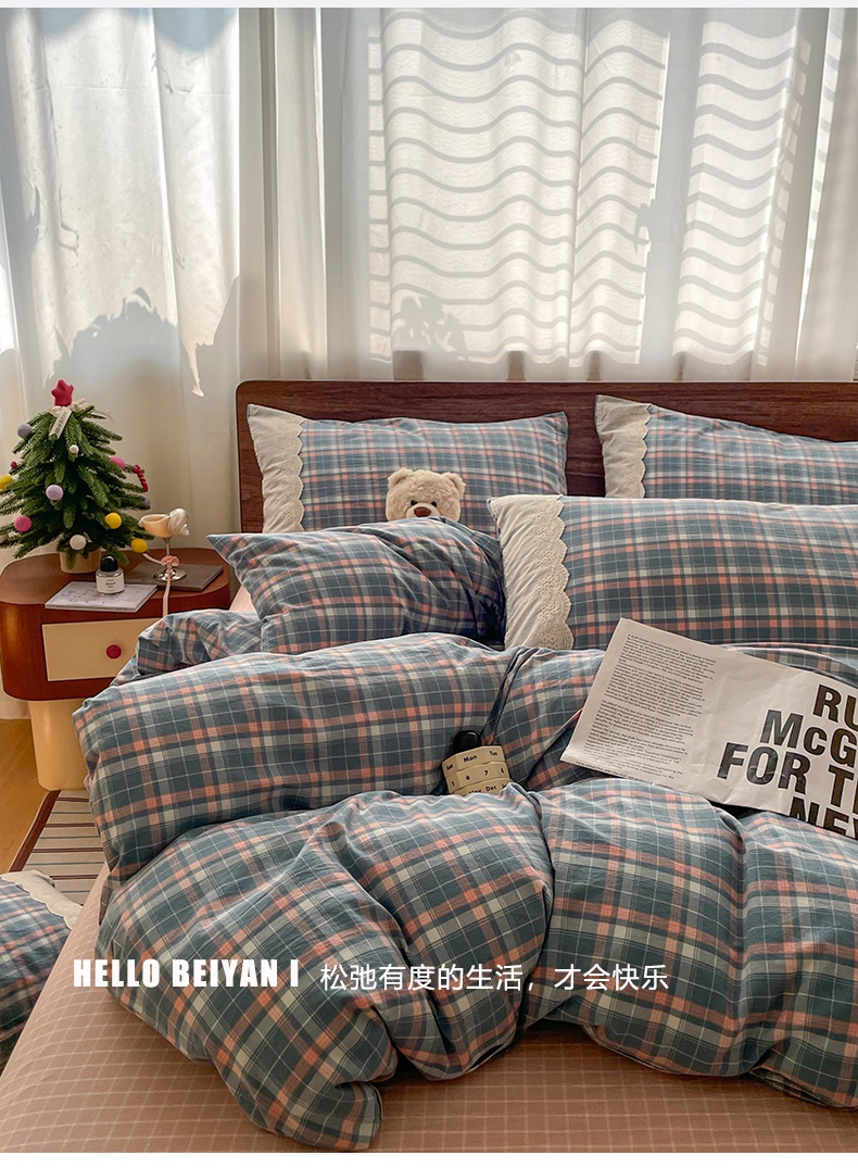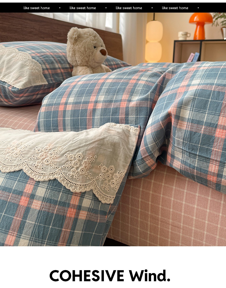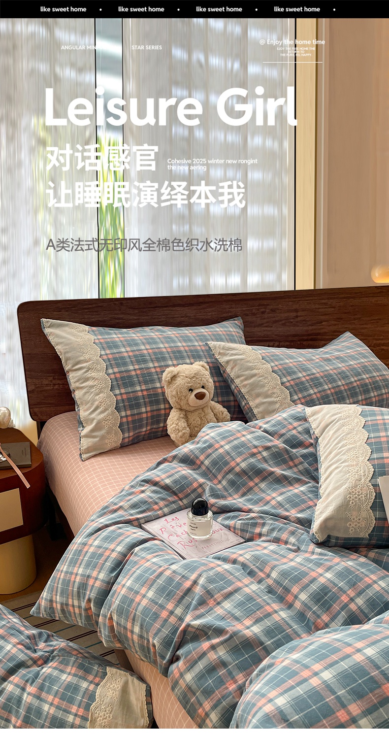 当前位置: 91家纺网 > 商品网购 > 床品套件 > 四件套 > 全棉普通四件套 > 花漾家居 2026新款全棉色织水洗棉复古花边无印格条被套三件套四件套 蓝莓厚乳