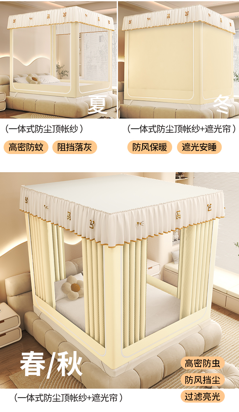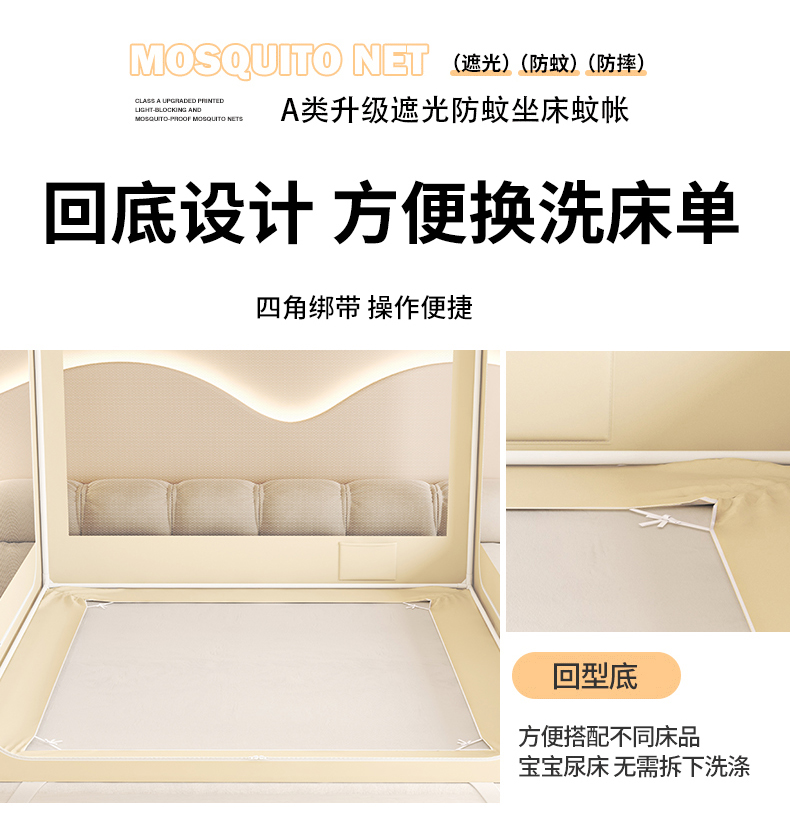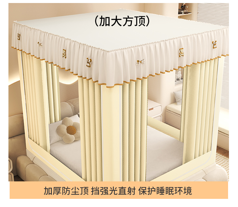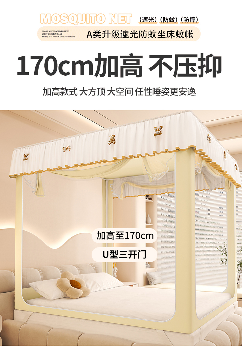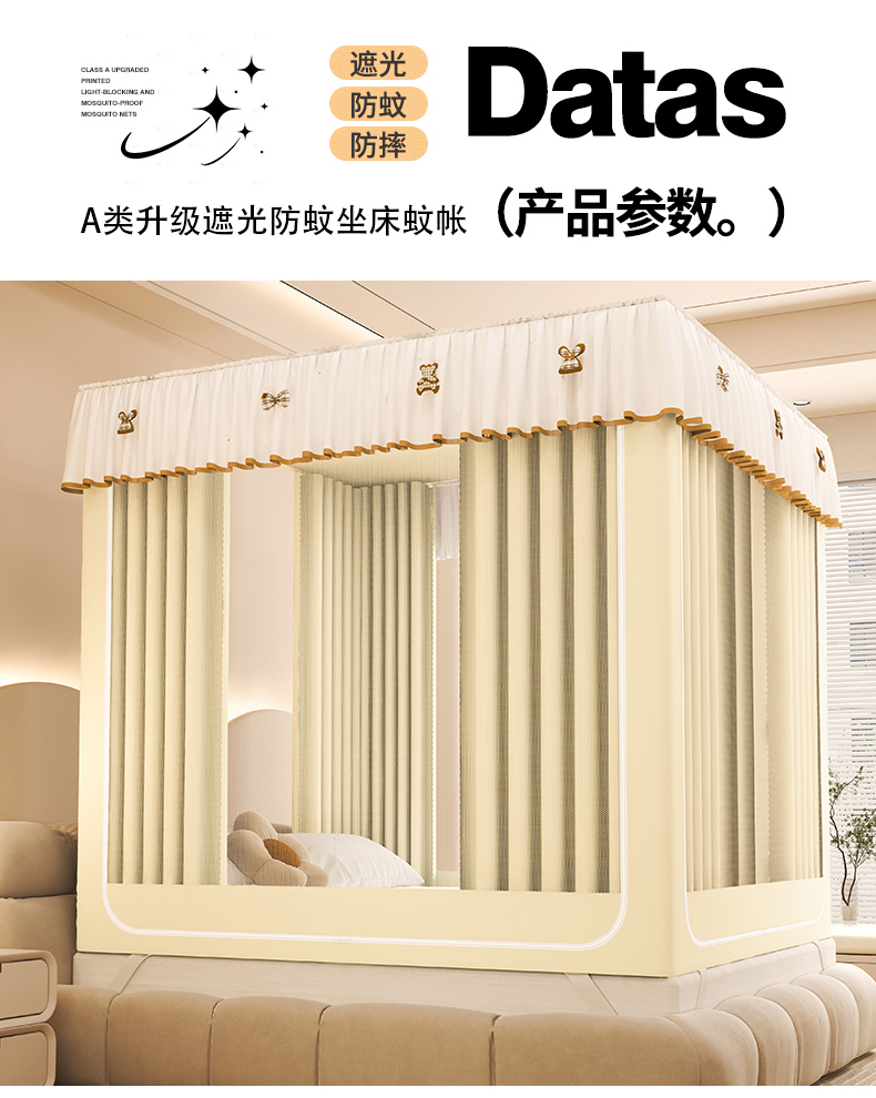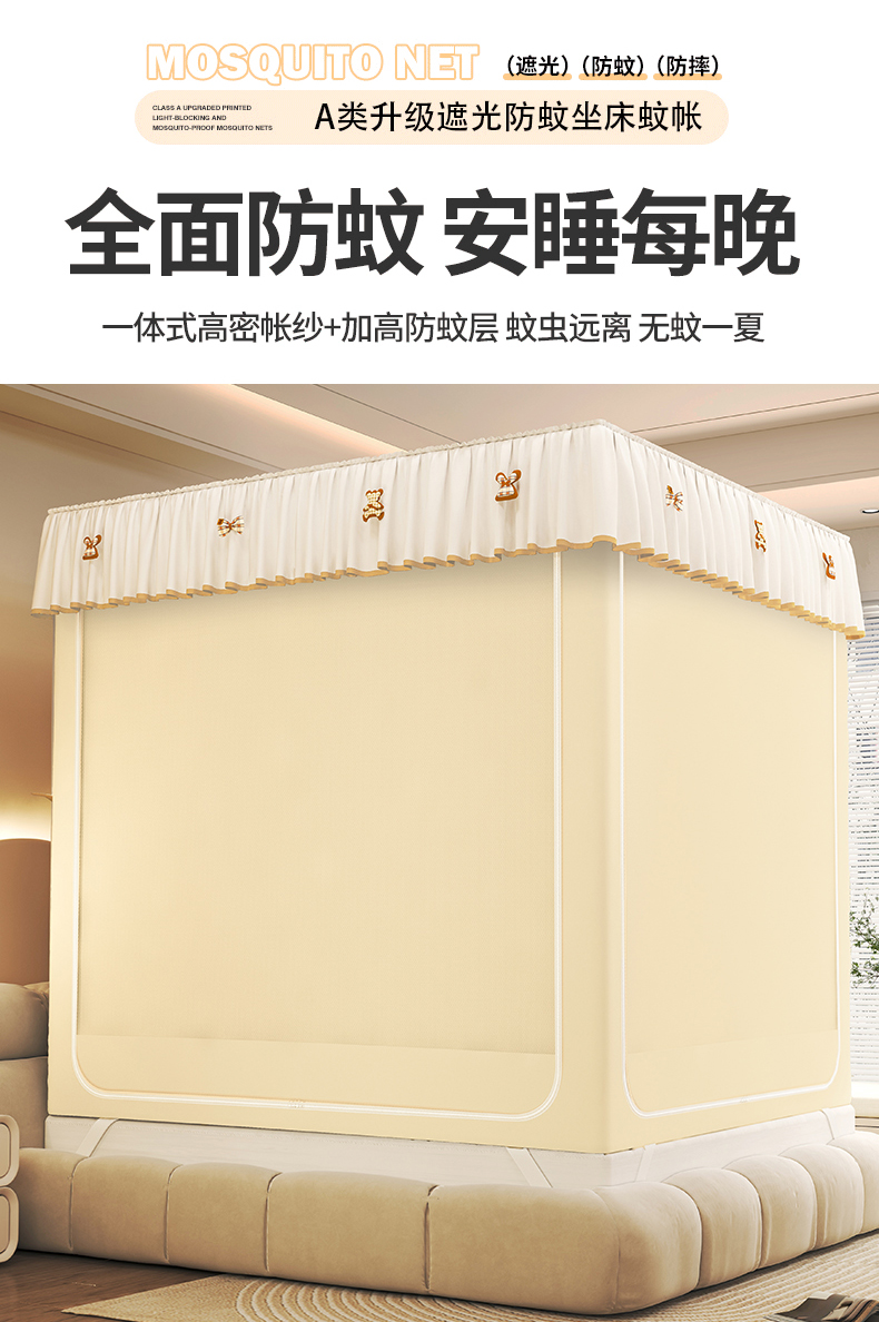 • 91家纺网 家纺一手货源 找家纺 初心家纺 2026新款时尚ins拉链式防摔坐床 床帘款遮光蚊帐 米黄(无帘)