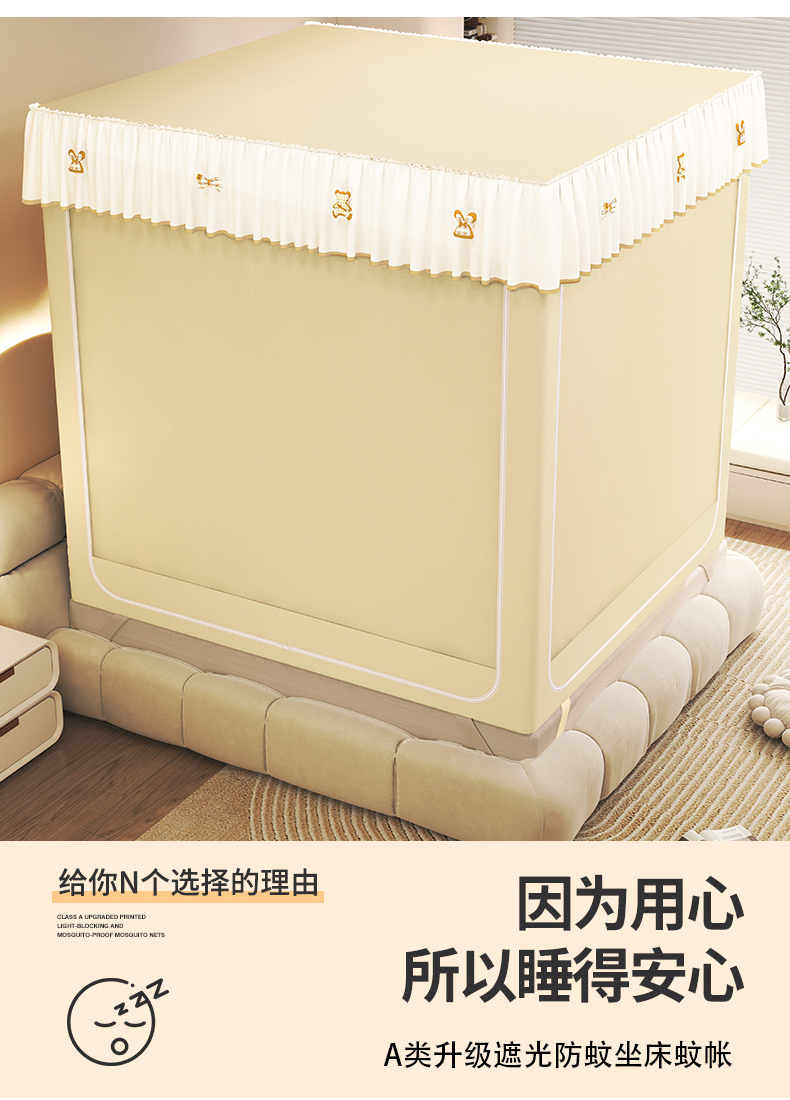 初心家纺 2026新款时尚ins拉链式防摔坐床 床帘款遮光蚊帐 米黄(无帘)