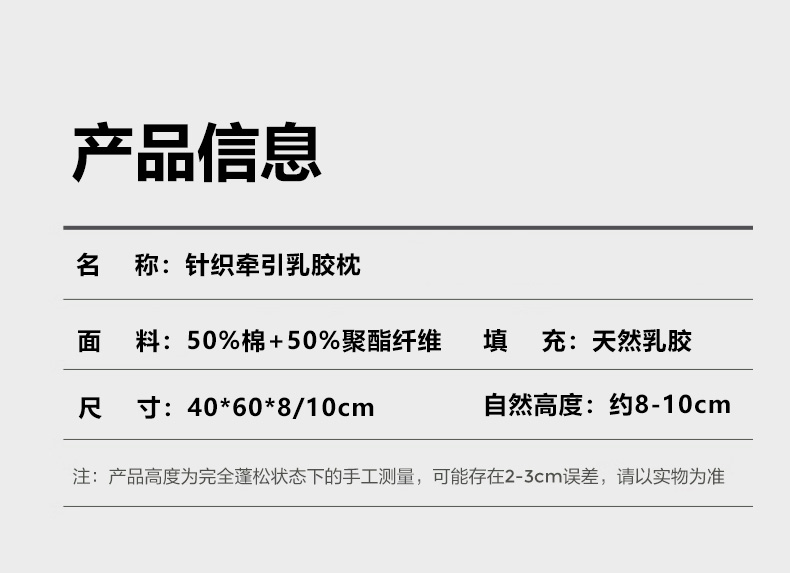 当前位置: 91家纺网 > 商品网购 > 枕头/枕芯/保健枕/颈椎枕 > 乳胶枕 > 乐可 2023新款针织牵引乳胶枕 针织牵引乳胶枕-灰色40*60*8/10cm【单只装】
