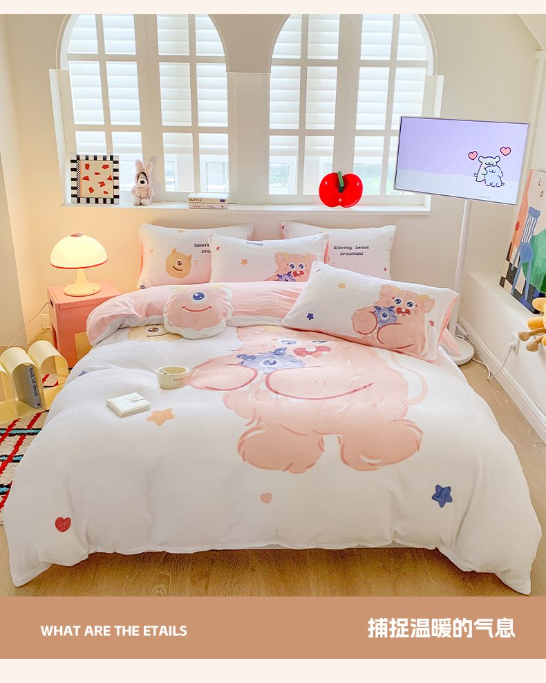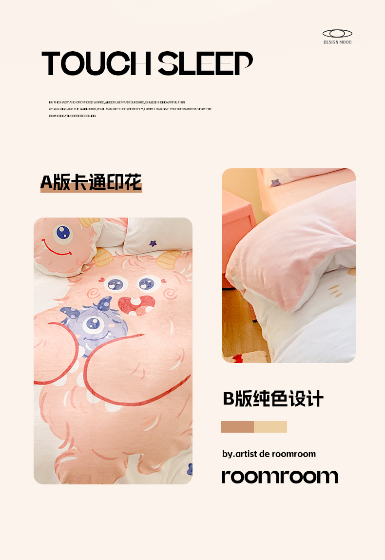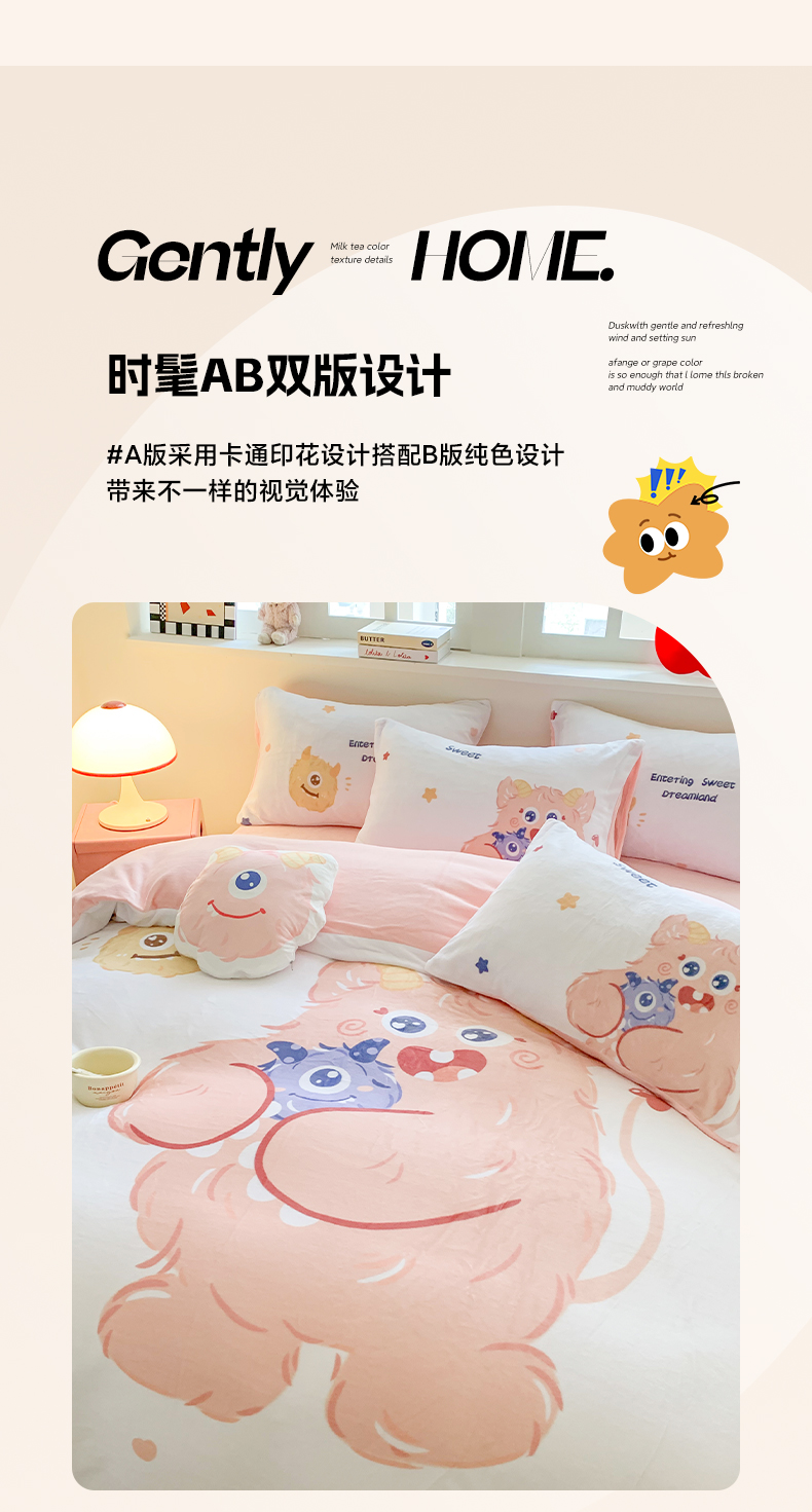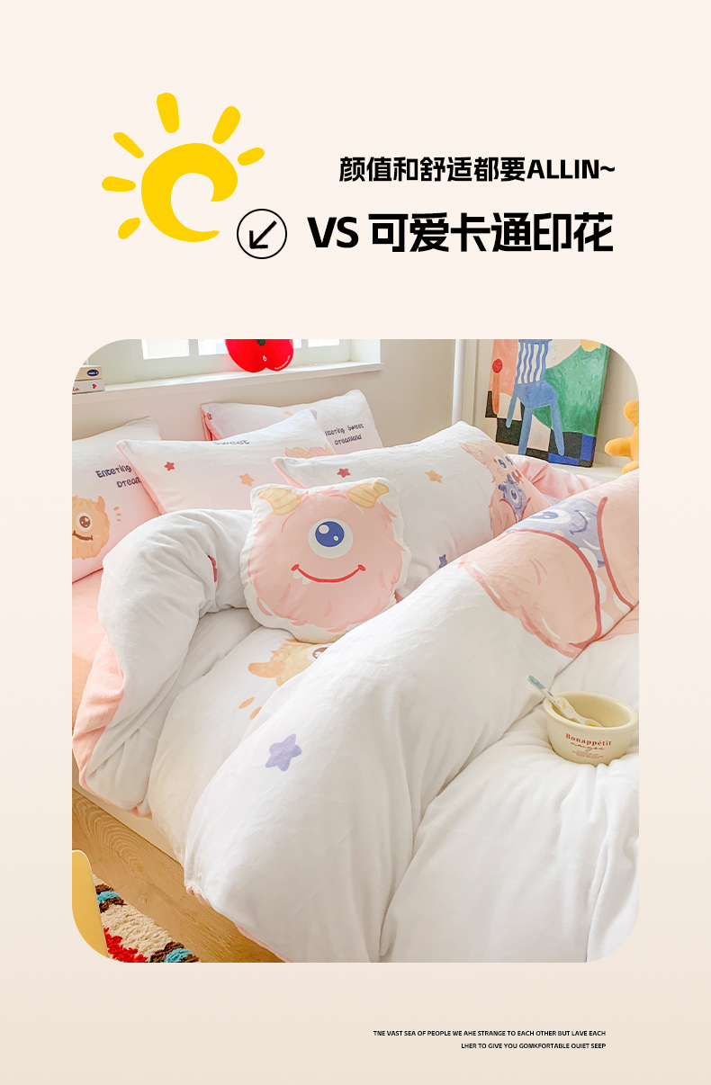 当前位置: 91家纺网 > 商品网购 > 床品套件 > 四件套 > 牛奶绒四件套 > 澳萝拉 2024新款牛奶绒数码印花四件套 抱抱小怪兽