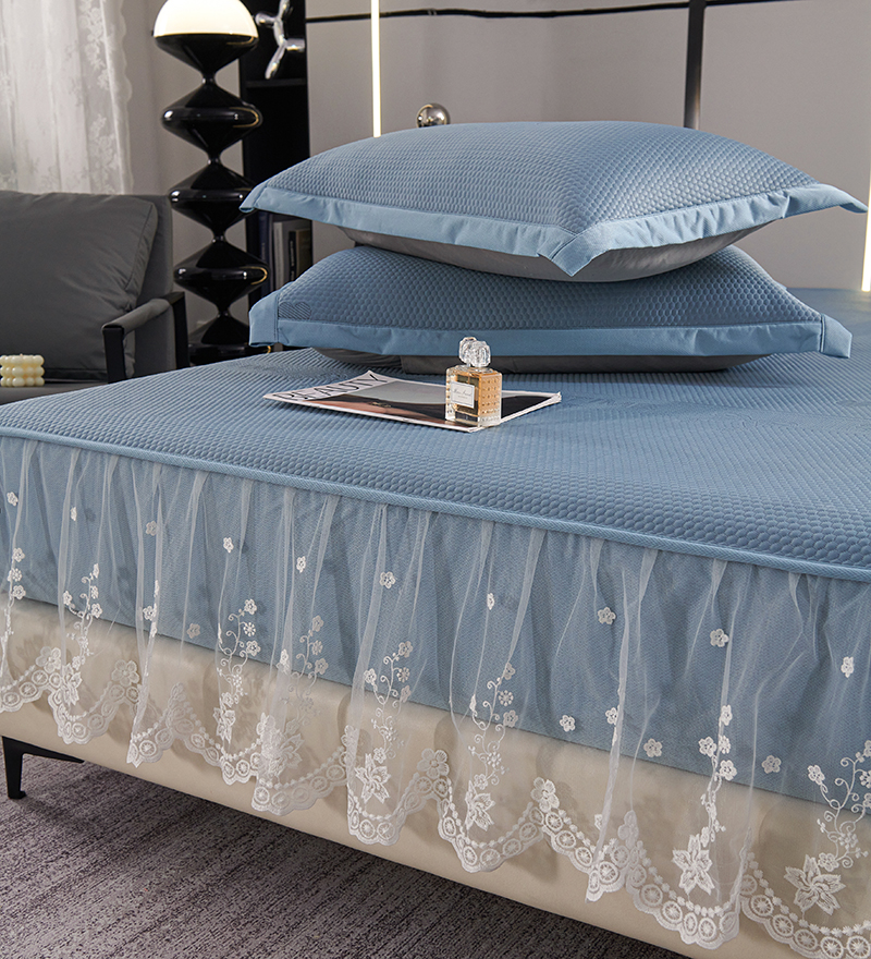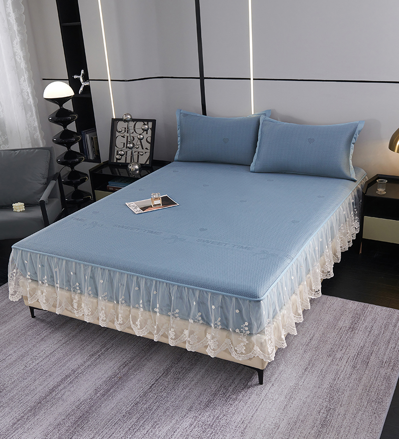 青雅席业 2025新款7A抗菌母婴级纯乙纶PE刺绣凉感丝豆豆席 床笠花边款 爱心蝴蝶结-蓝