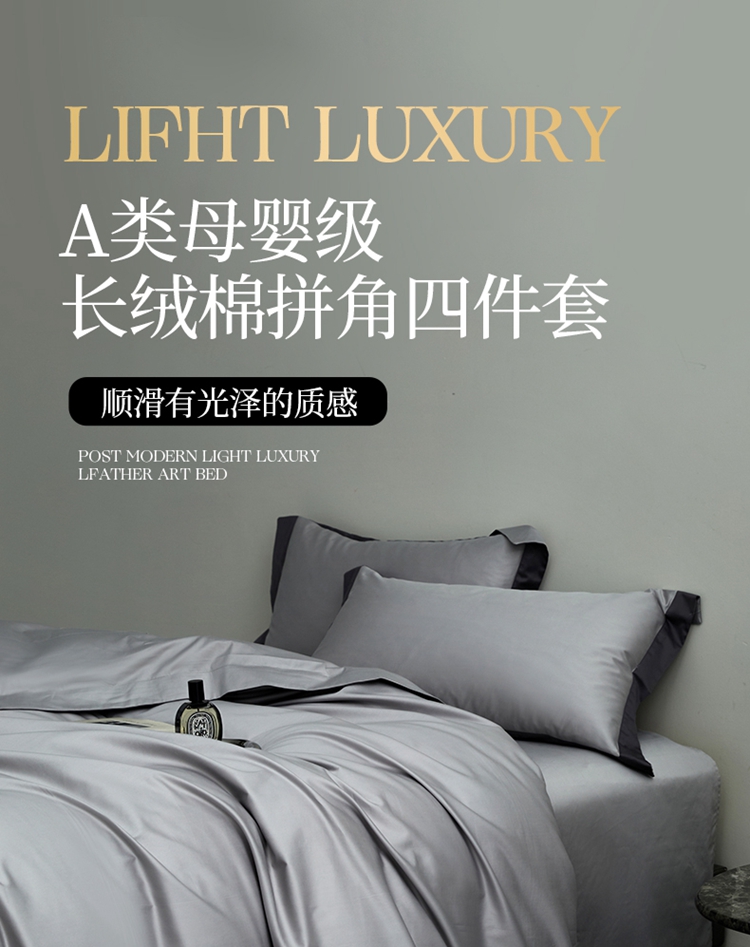 柔觉家纺 新款50*50双股长绒棉纯色拼角四件套 雅-圣雅银
