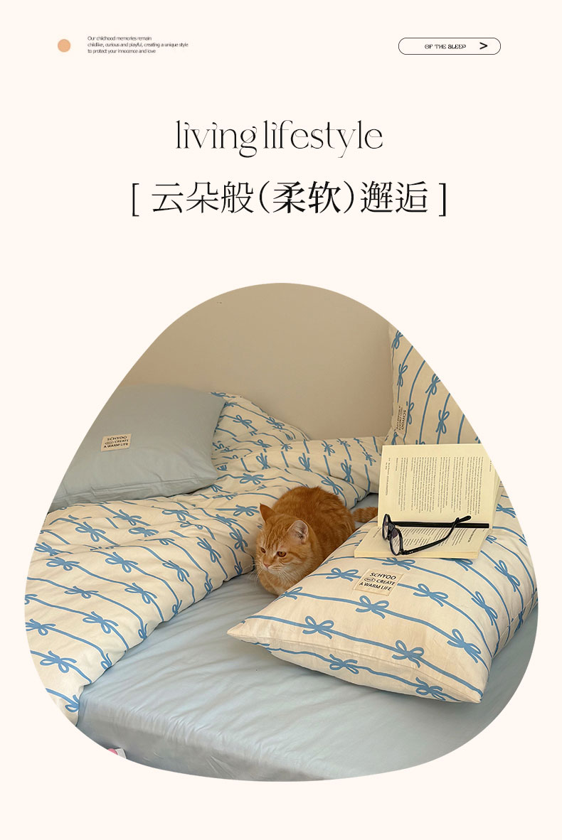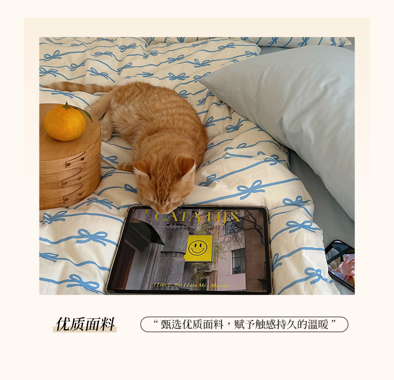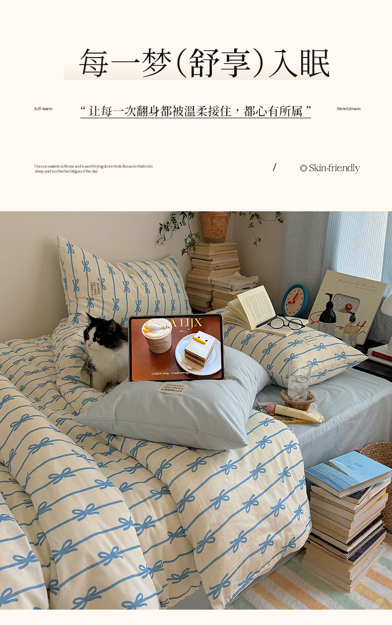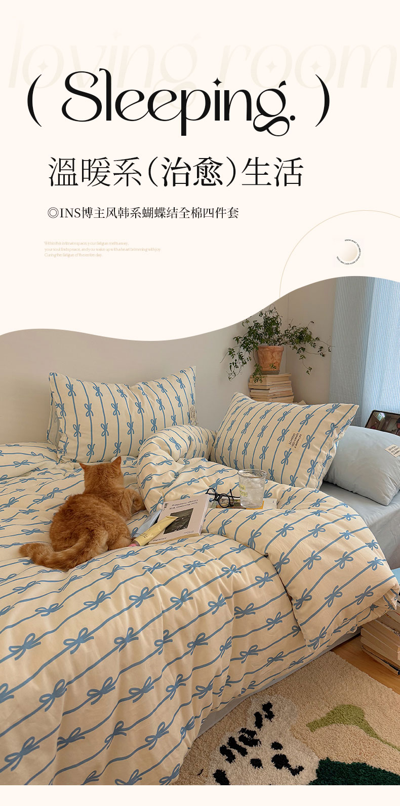 六巷胡同 2026春夏新款INS博主风韩系蝴蝶结全棉四件套 丝带蝴蝶结-蓝