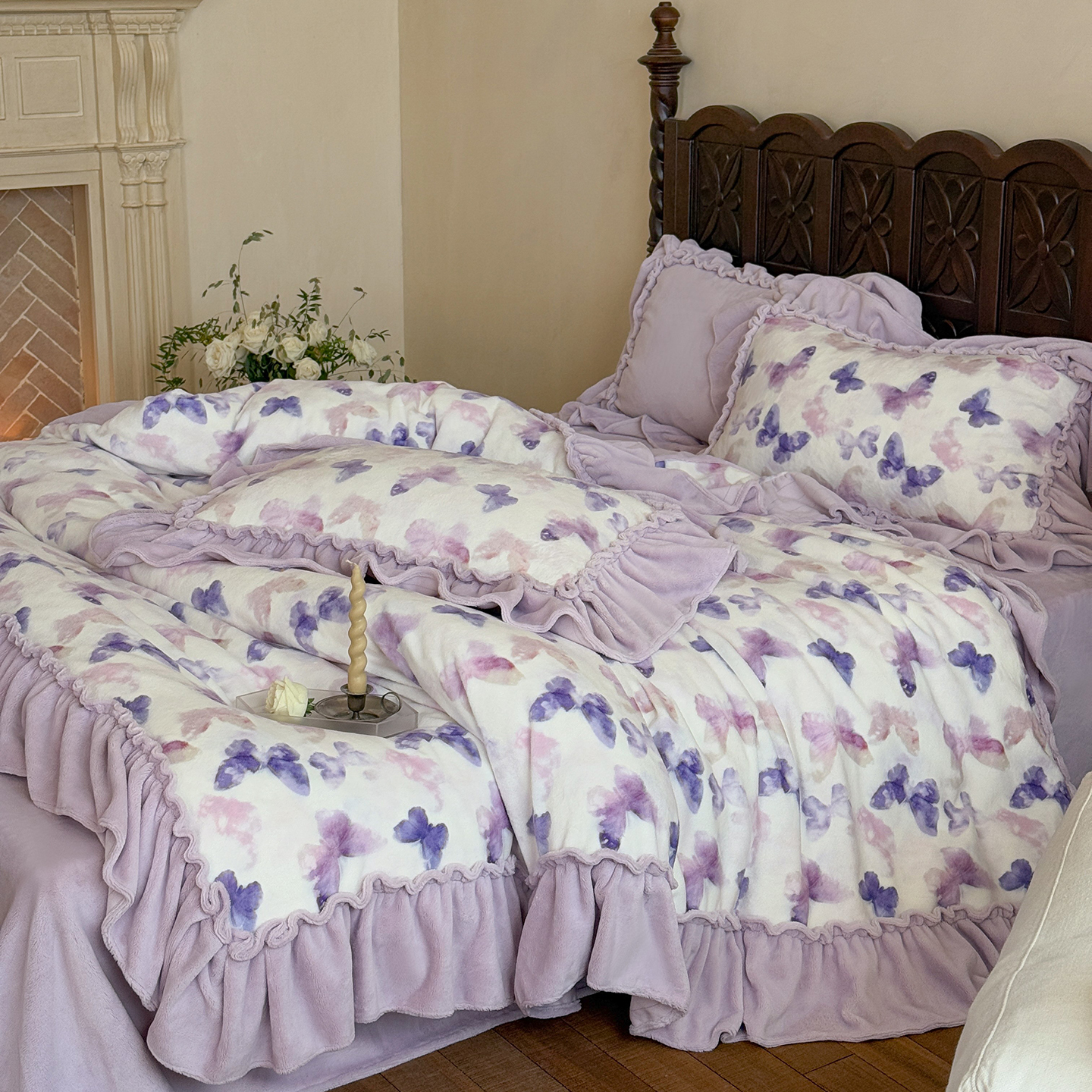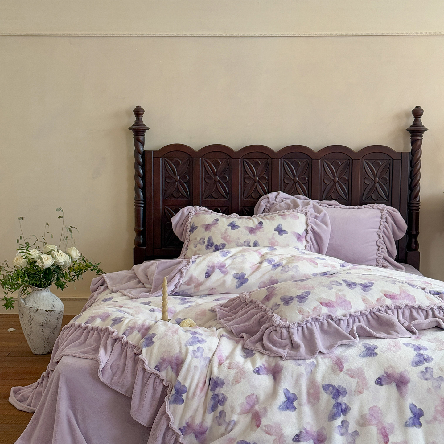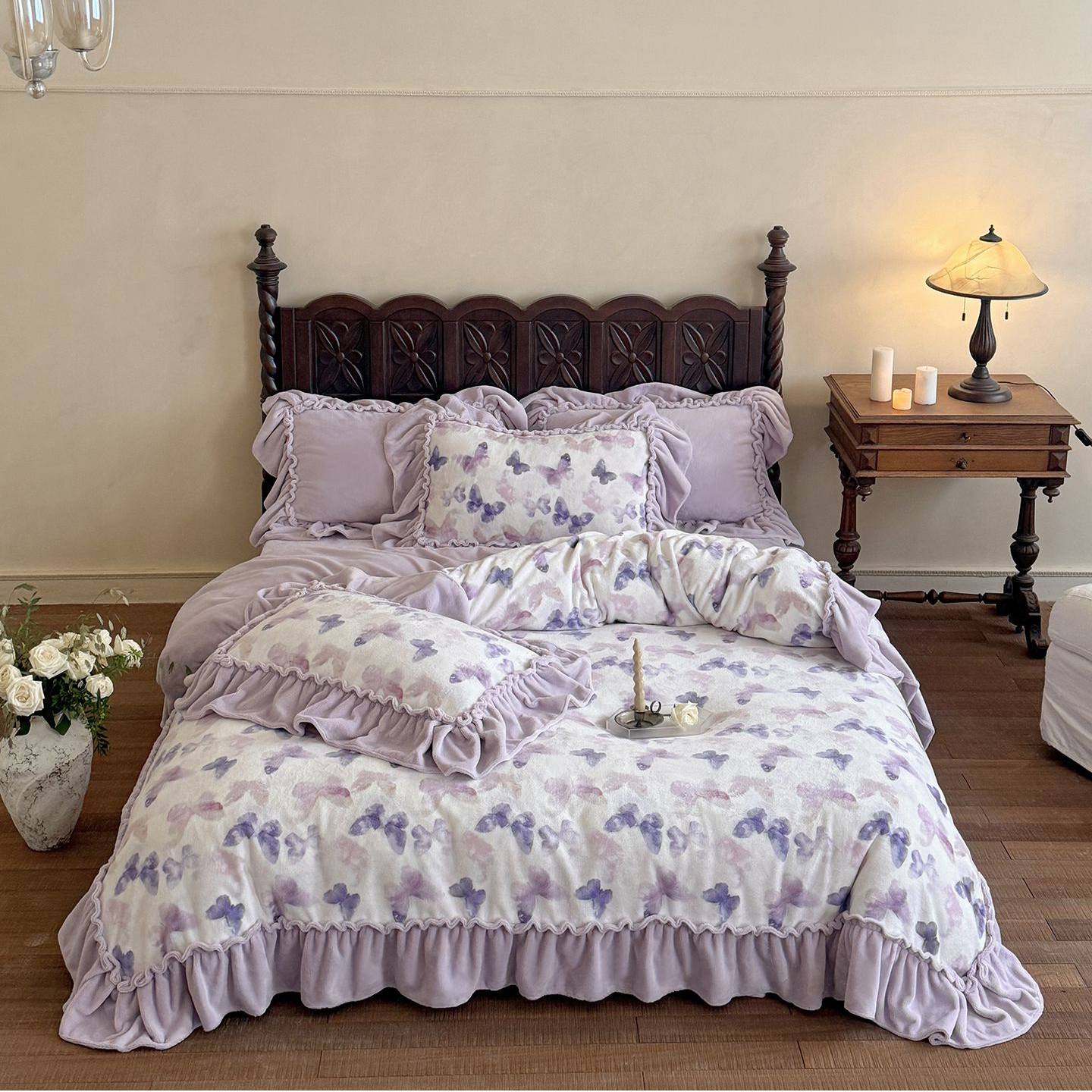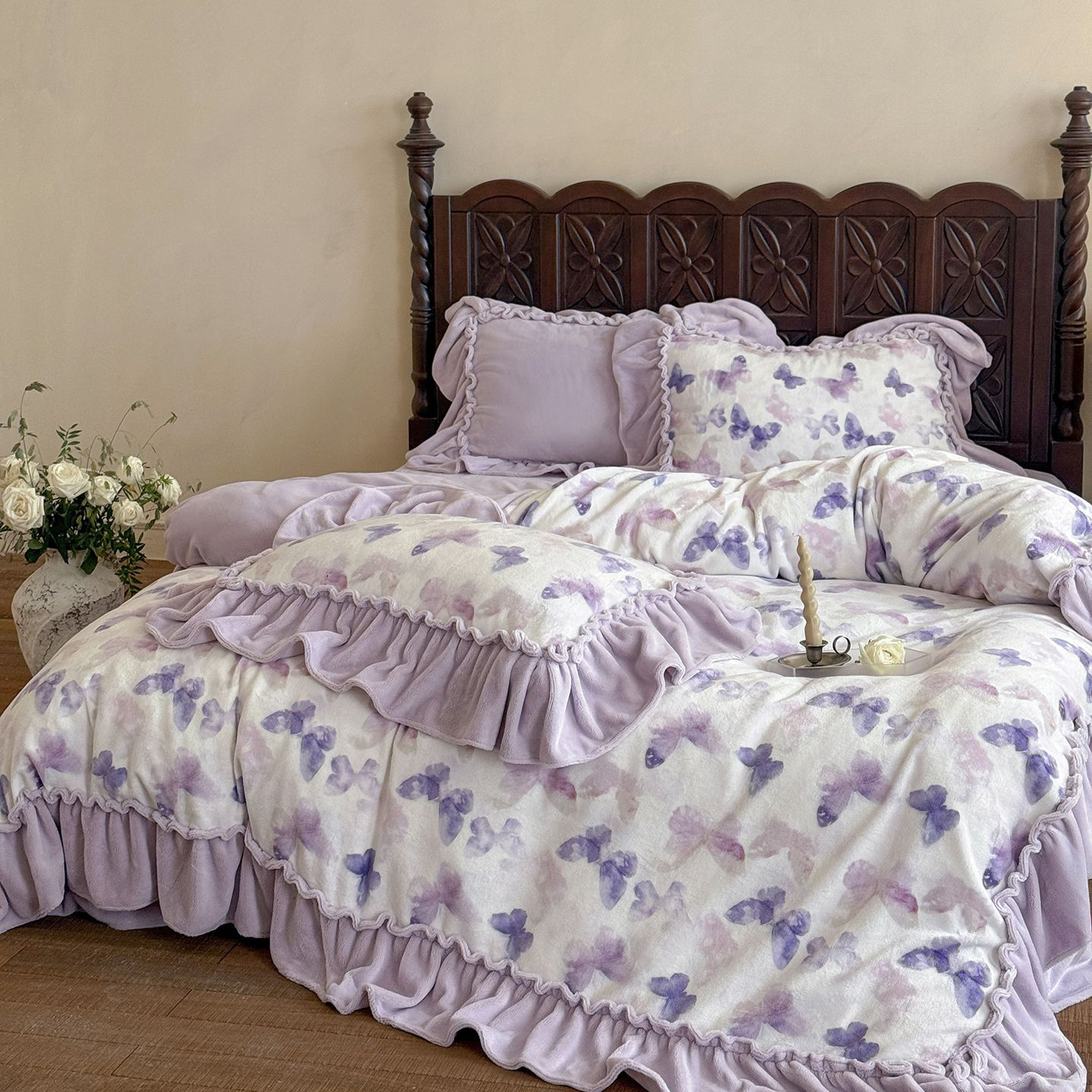 (总)多乐娜 2025新款轻法式精梳纯棉长绒棉工艺款四件套水洗棉韩版轻奢风-极光暮紫【控价:328/348元起】,极光暮紫