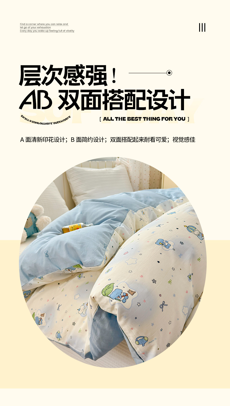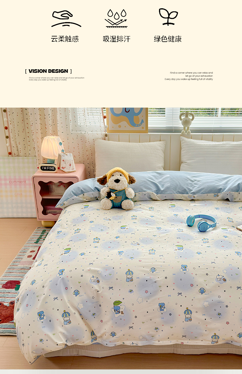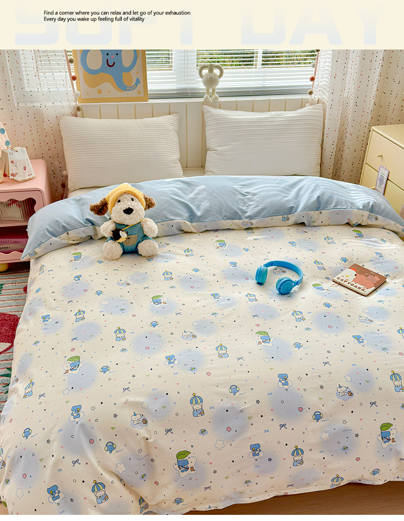 • 91家纺网 家纺一手货源 找家纺 清雅福 2026春夏新款INS小清新40支全棉13372单被套第二批 蓝色小象