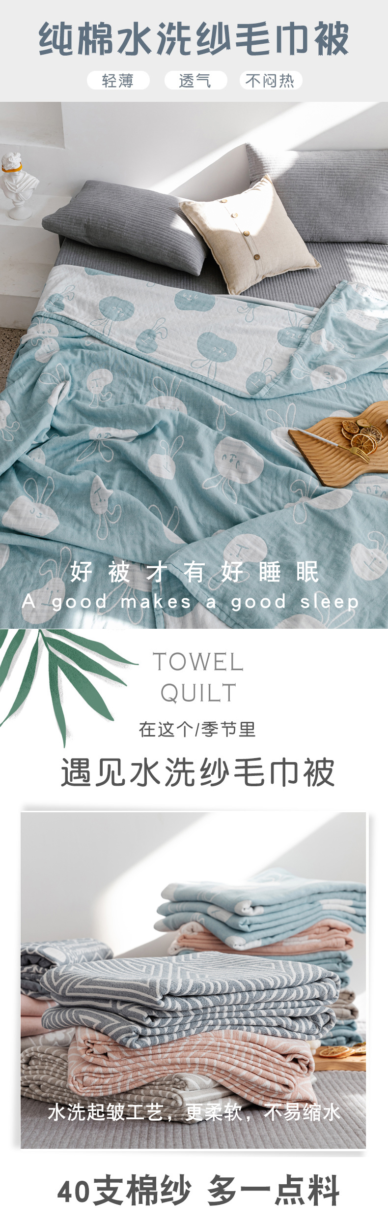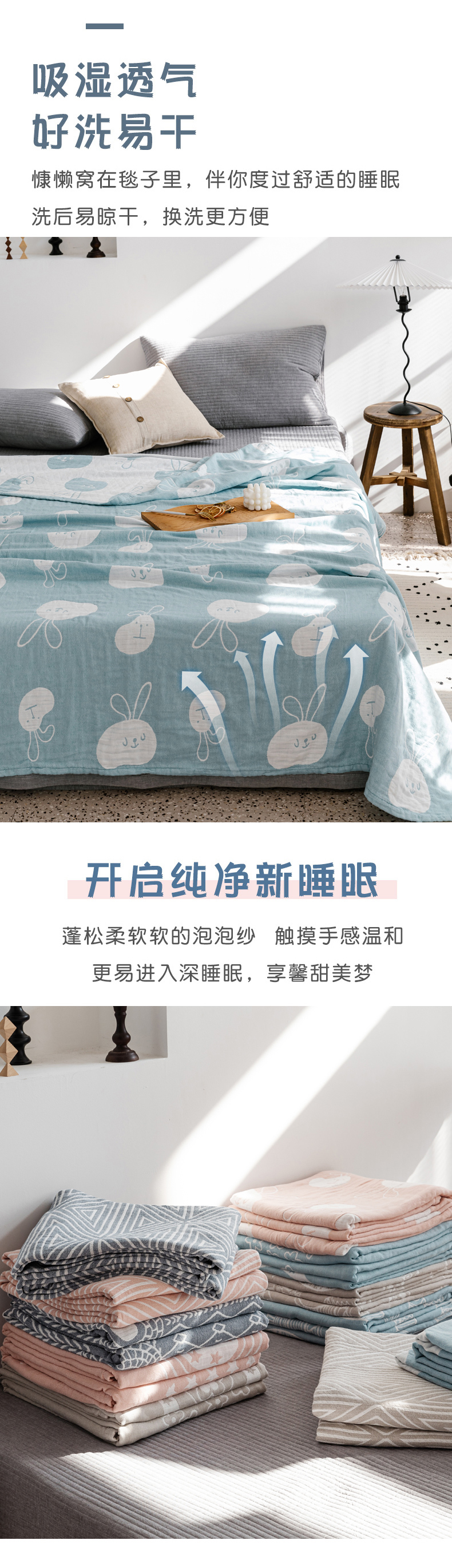商品名称:朴尔家纺-毛巾被 2026春夏新款加厚三层水洗棉全棉纯棉纱布毛巾被夏被夏凉被空调被 灵动兔-兰