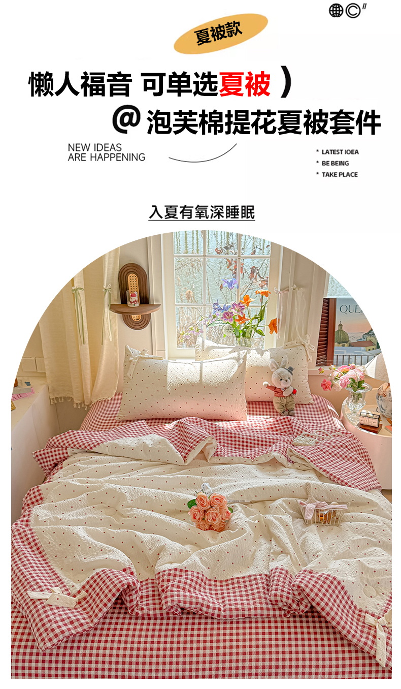 商品名称:(总)爱彼家纺 2026春夏新款提花泡芙棉拼角蝴蝶结软乎乎的撸猫感单夏被夏被四件套-甜莓气泡