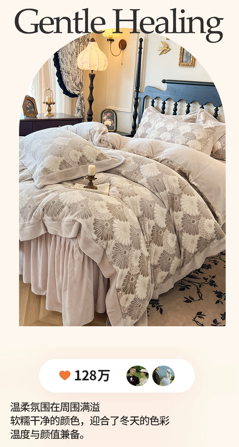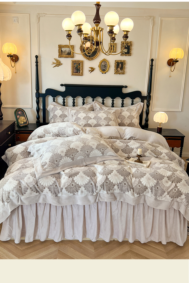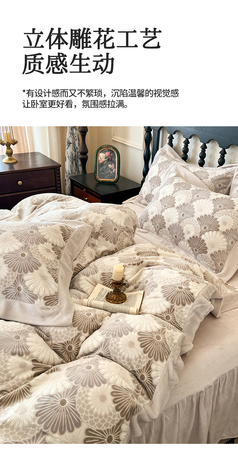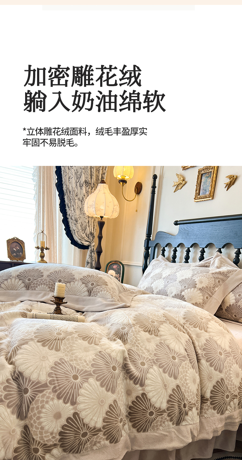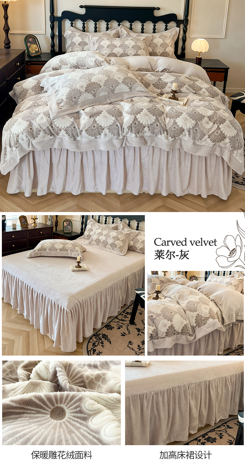 当前位置: 91家纺网 > 商品网购 > 床品套件 > 四件套 > 雕花绒四件套 > 麒豆豆 2024新款简约系类雕花绒床裙四件套 莱尔-灰