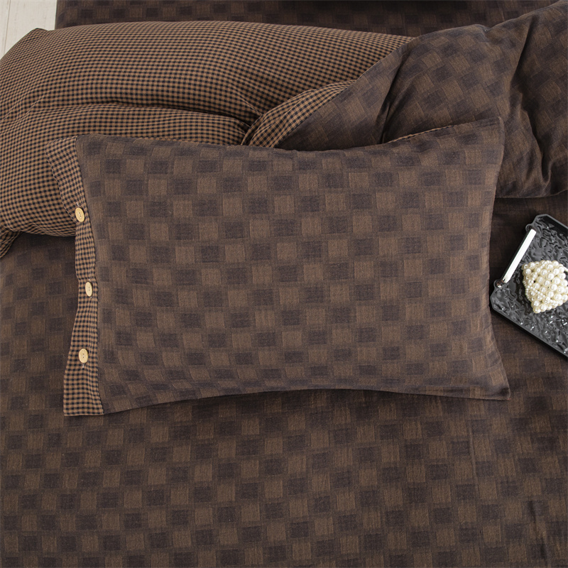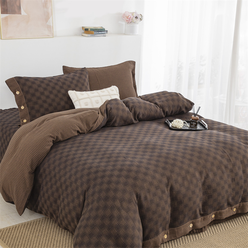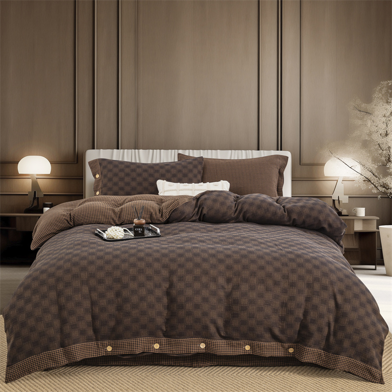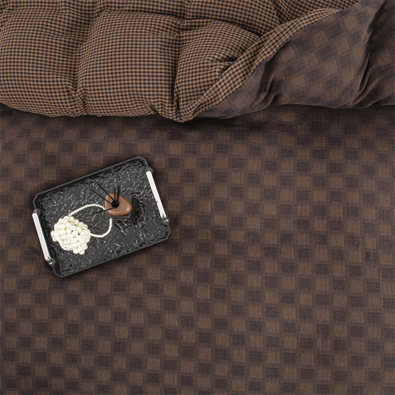商品名称:双层纱家居 2025新款格子款双层纱四件套 朦胧格深咖色