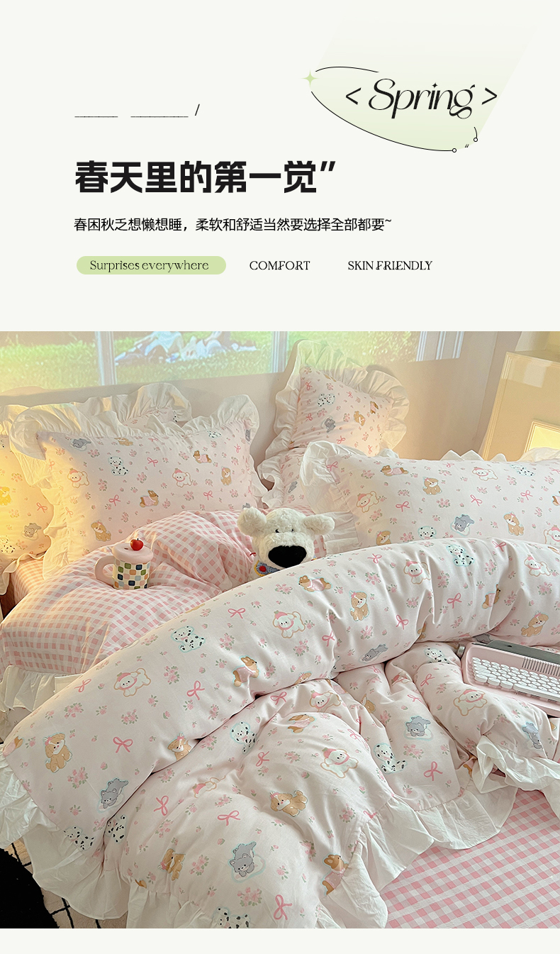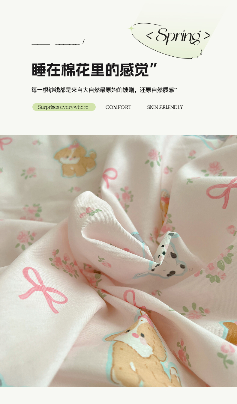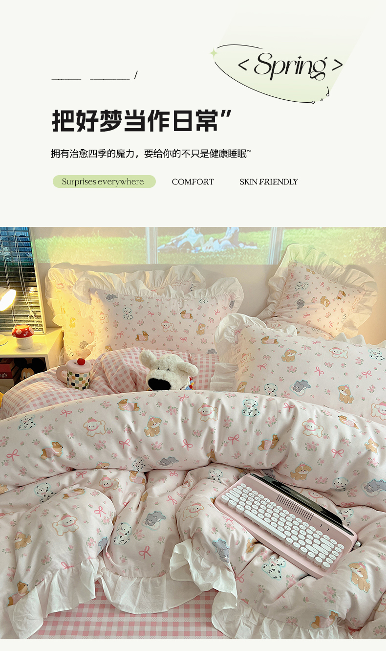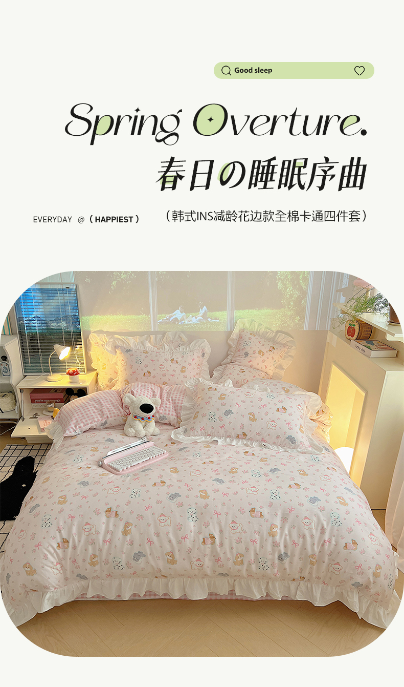 商品名称:六巷胡同 2026春夏新款韩式INS减龄花边款全棉卡通四件套 花边浪漫碎花犬