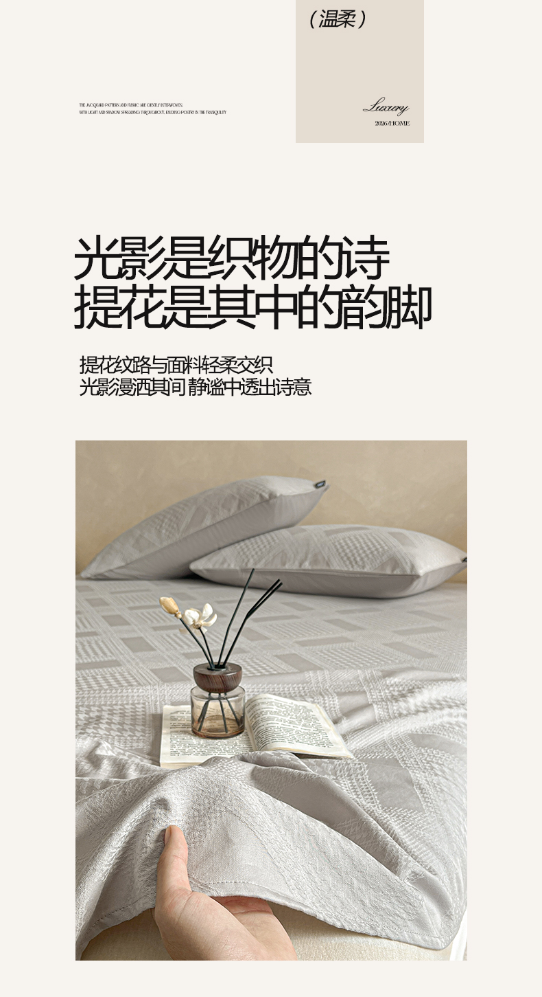 (总)涵宸家纺 2026新款全棉提花里拉系列四件套,柏拉-白,花夕-粉,凌维-灰,凌维-绿,律动格韵,千喜格,沁语-粉金,沁语-奶白,沁语-紫,山慕色,甜心漾,微芒,雾絮-灰,雾絮-奶白,毓影-豆沙,毓影-奶白,云暖-粉,云暖-紫,织羽