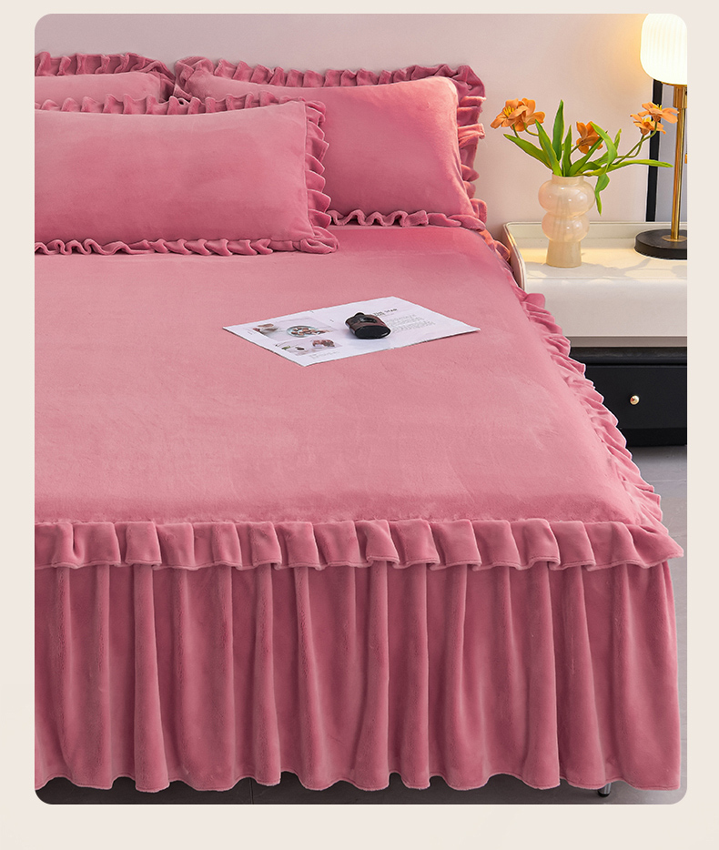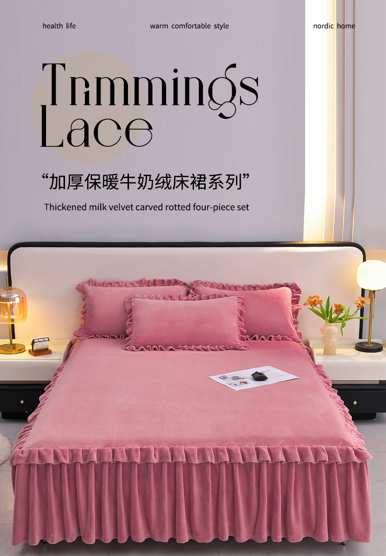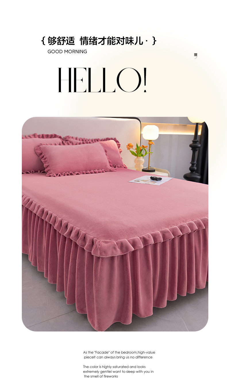 优家居工厂店 2026新款纯色韩版花边牛奶绒床裙床罩加厚直播外贸可定做 盛世-豆沙