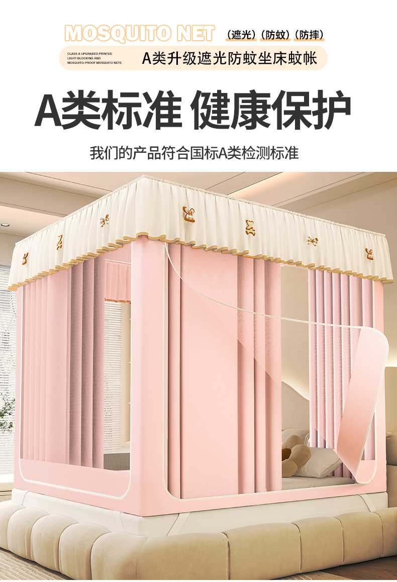 初心家纺 2026新款时尚ins拉链式防摔坐床 床帘款遮光蚊帐 粉玉(带帘)