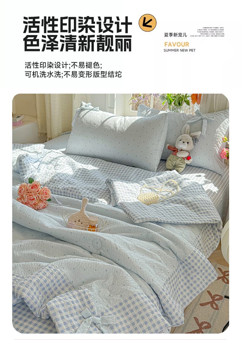 • 91家纺网 家纺一手货源 找家纺 爱彼家纺 2026春夏新款提花泡芙棉拼角蝴蝶结软乎乎的撸猫感单夏被夏被四件套-甜莓气泡 泡芙夏被-海盐蓝波点