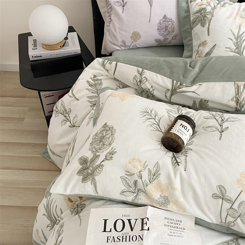商品名称:榻尚家居 2023秋冬新品高克重230克洛克绒四件套-铃兰物语 铃兰物语-绿