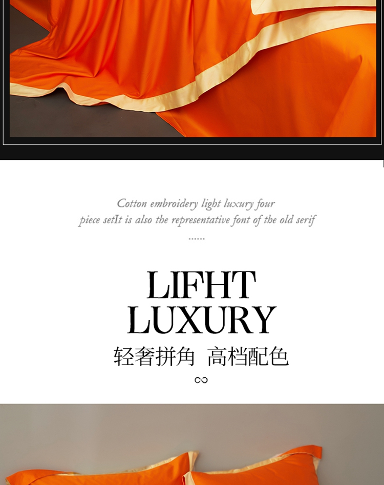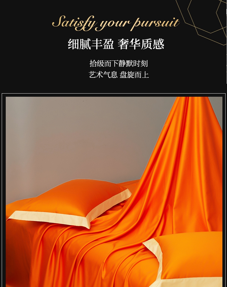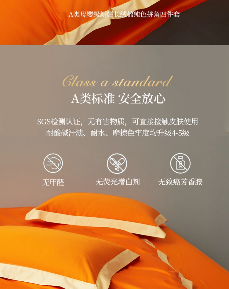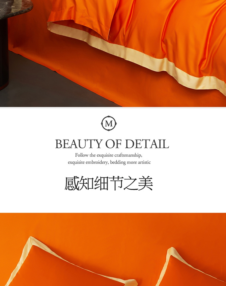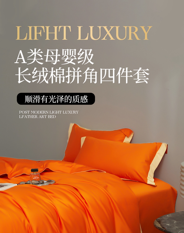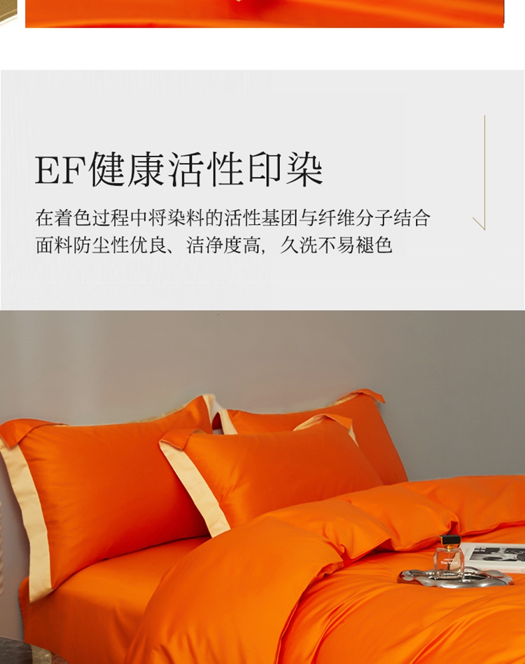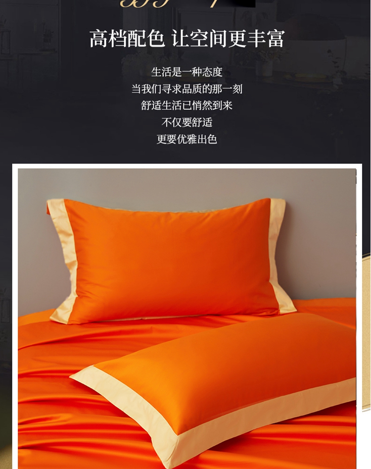 商品名称:柔觉家纺 新款50*50双股长绒棉纯色拼角四件套 雅-阳光橙