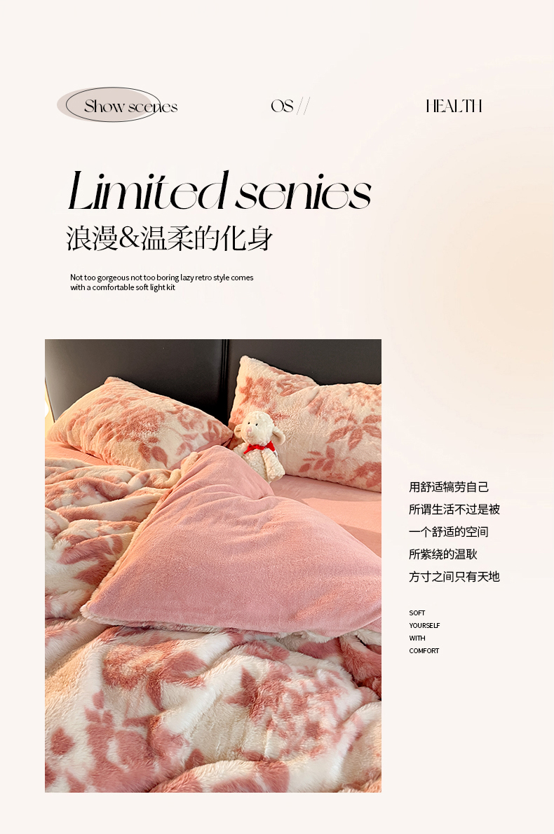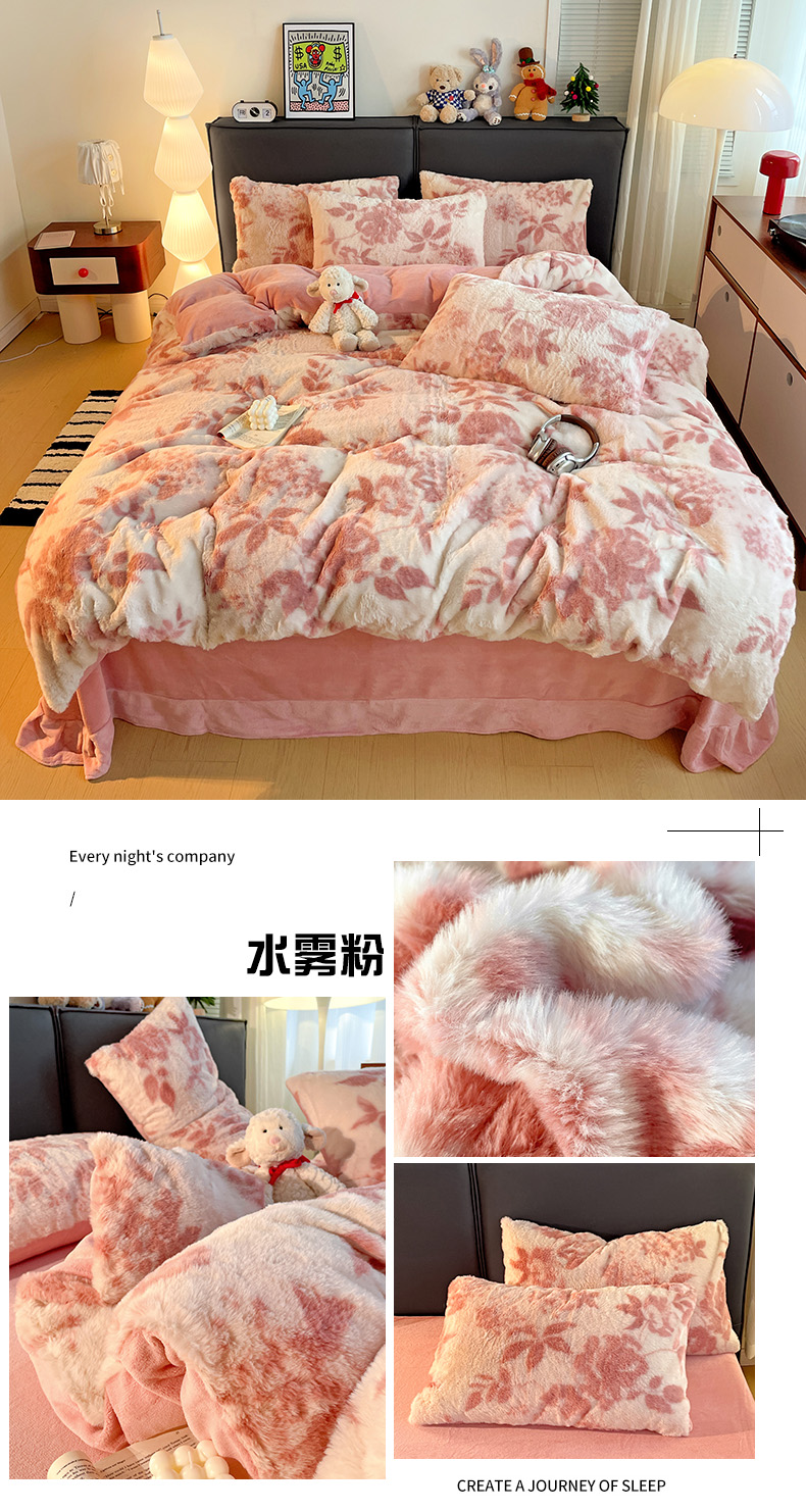 商品名称:金梦拉 2025直播爆款A类加厚兔绒印花系列四件套 水雾粉