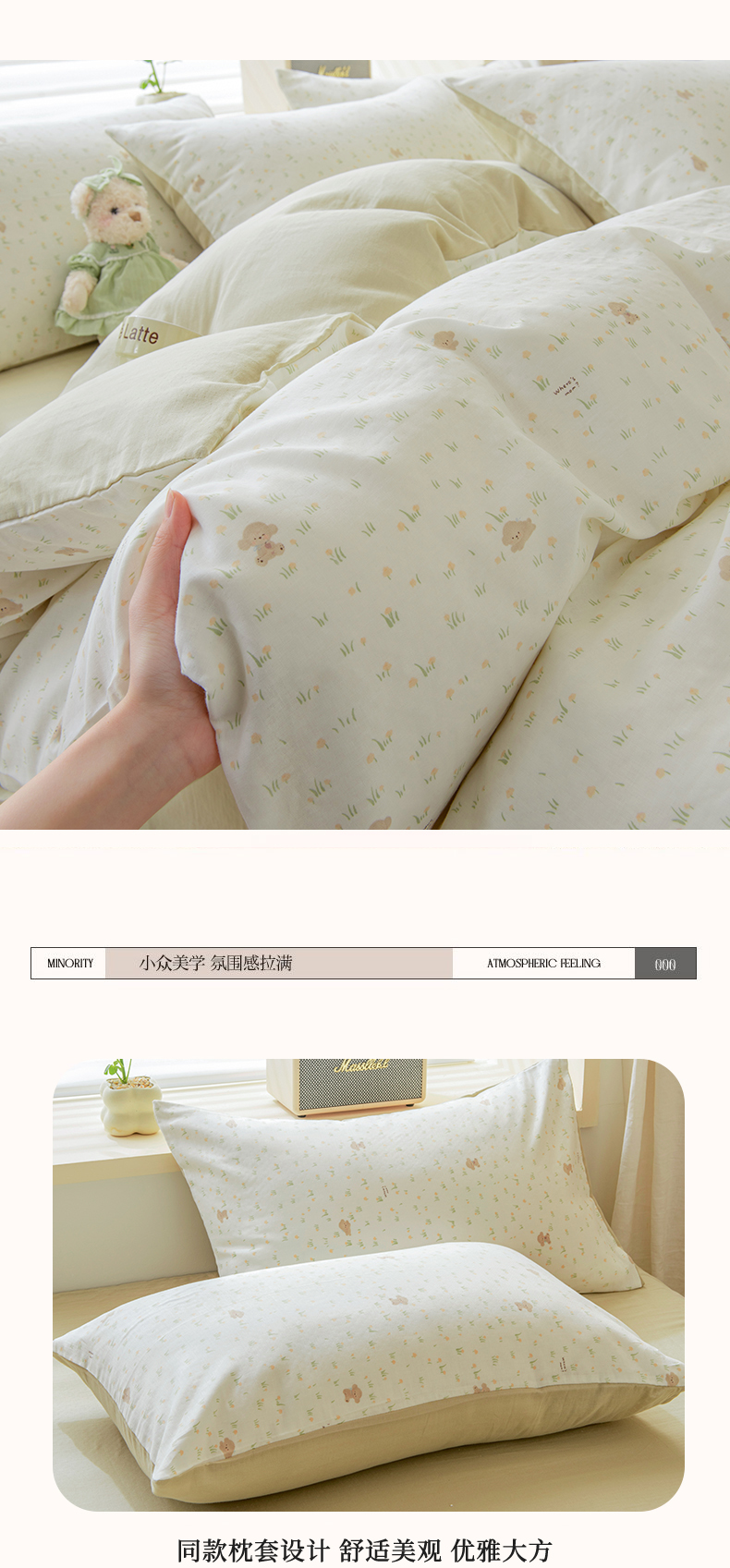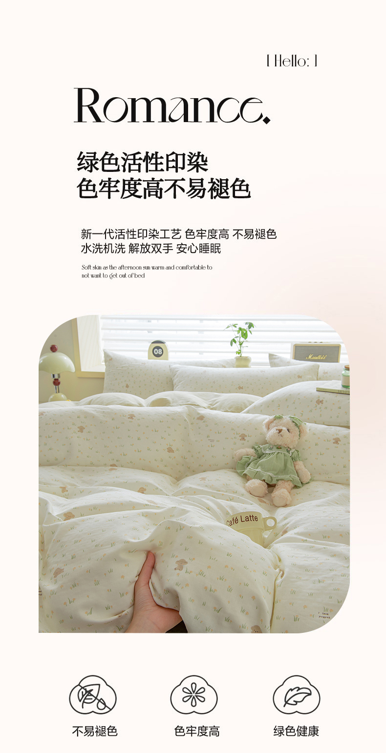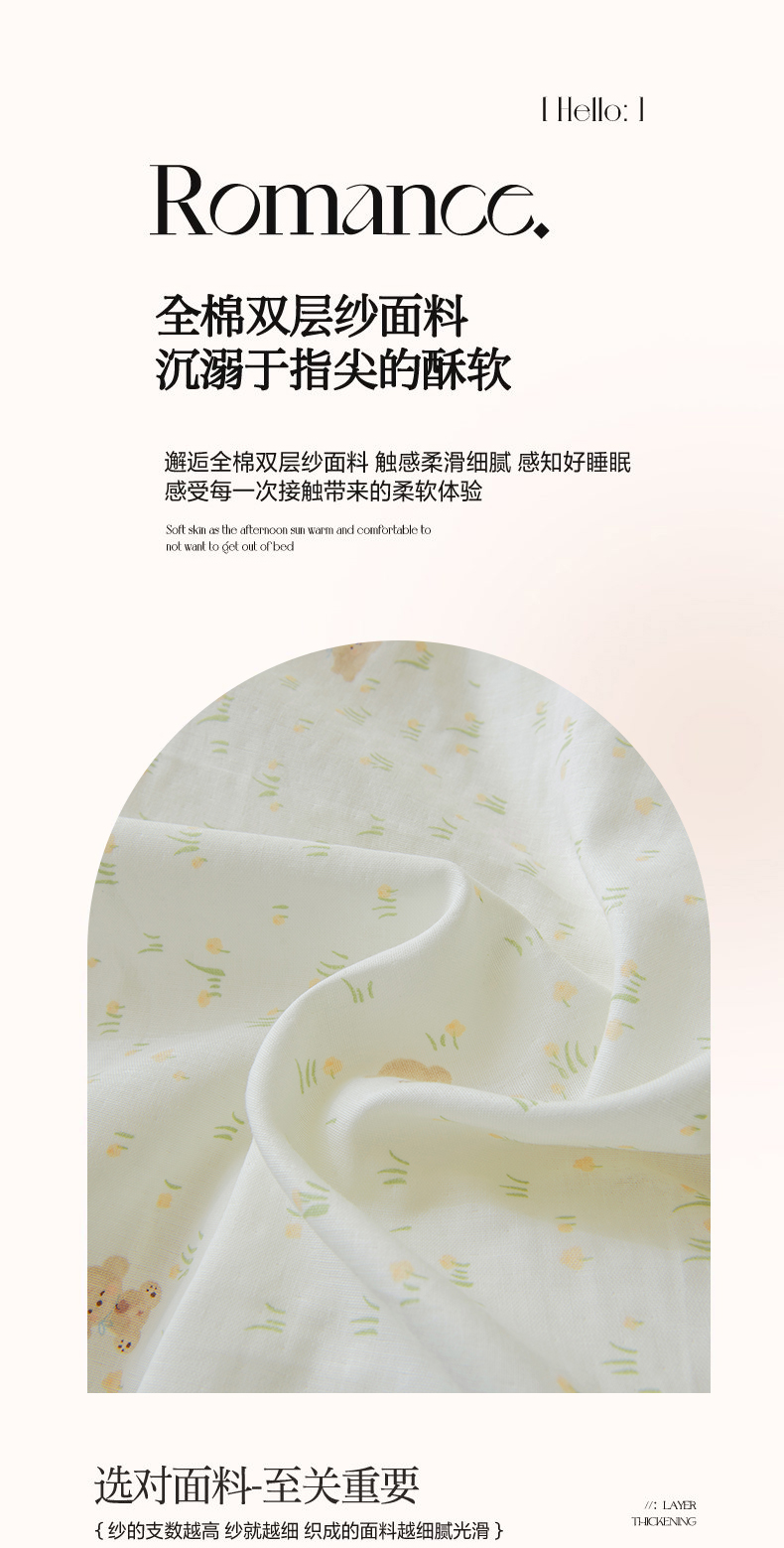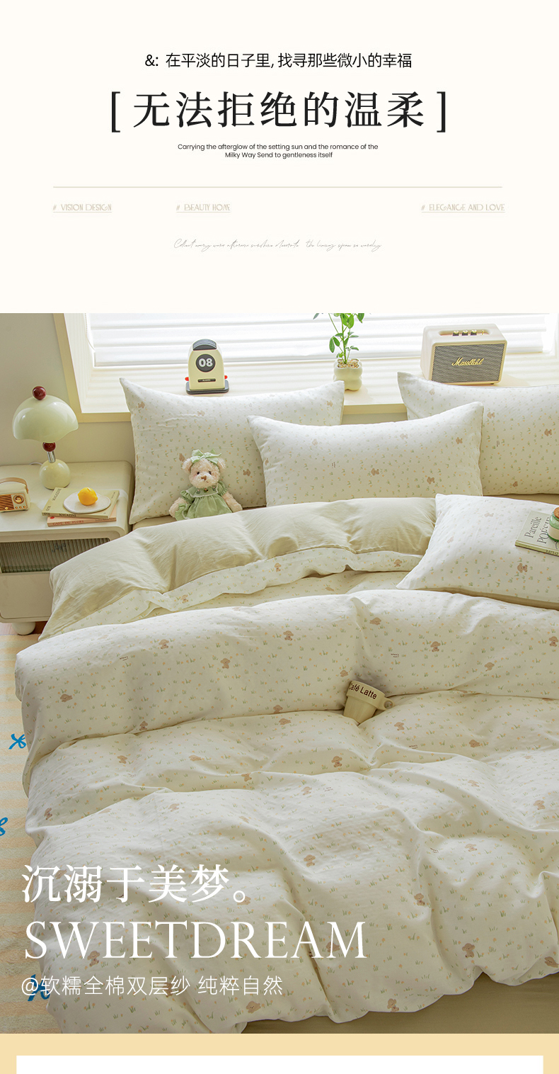 商品名称:雯雨家纺 2026春夏新款A类全棉有氧双层纱印花简约款四件套 田园小熊