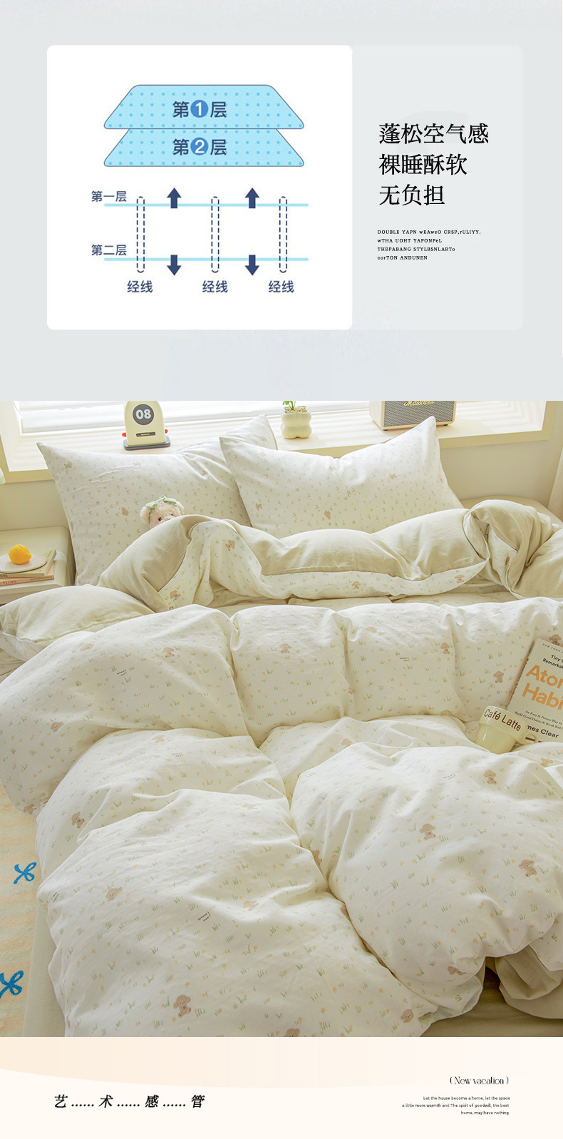 雯雨家纺 2026春夏新款A类全棉有氧双层纱印花简约款四件套 田园小熊