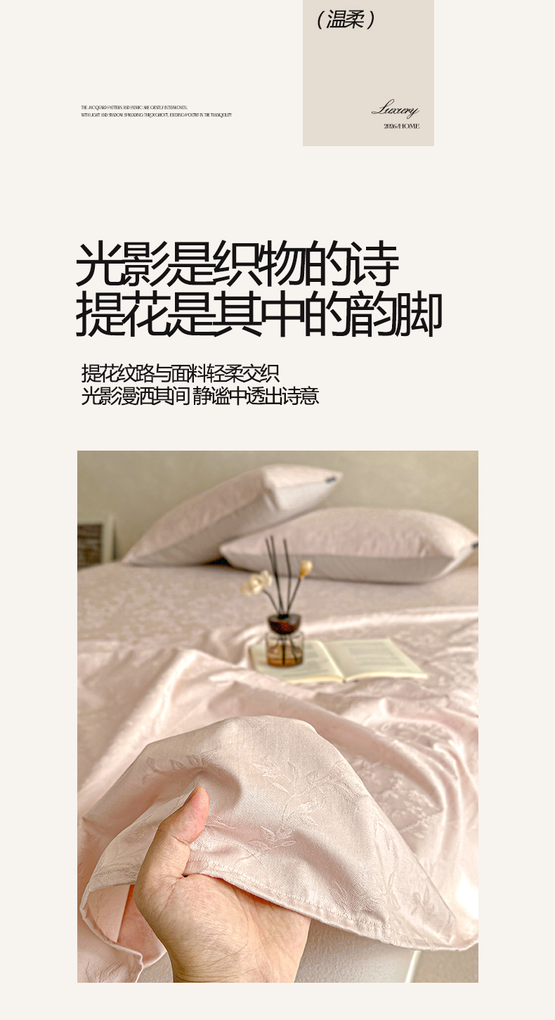 (总)涵宸家纺 2026新款全棉提花里拉系列四件套,柏拉-白,花夕-粉,凌维-灰,凌维-绿,律动格韵,千喜格,沁语-粉金,沁语-奶白,沁语-紫,山慕色,甜心漾,微芒,雾絮-灰,雾絮-奶白,毓影-豆沙,毓影-奶白,云暖-粉,云暖-紫,织羽