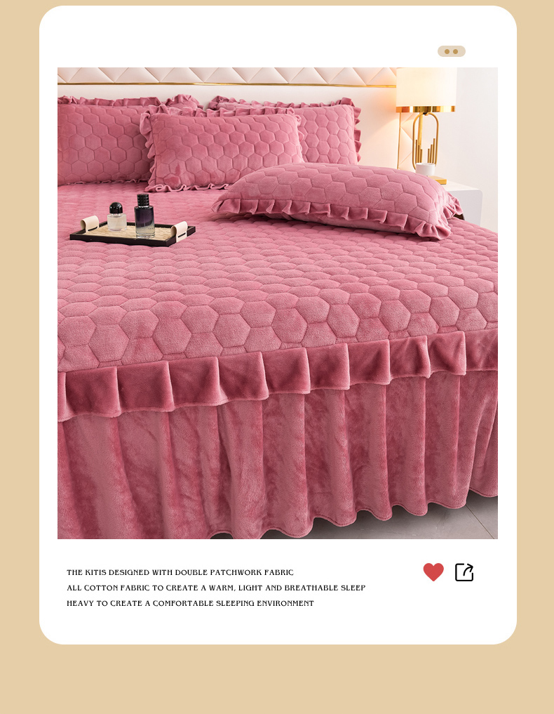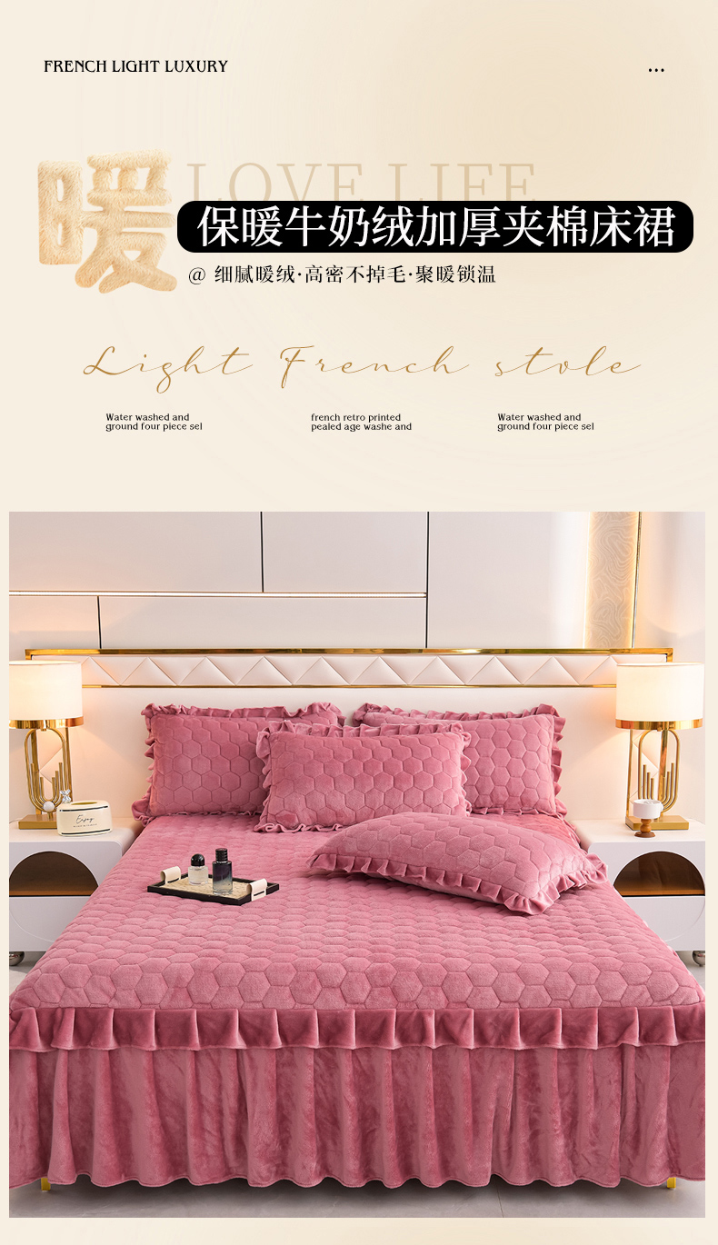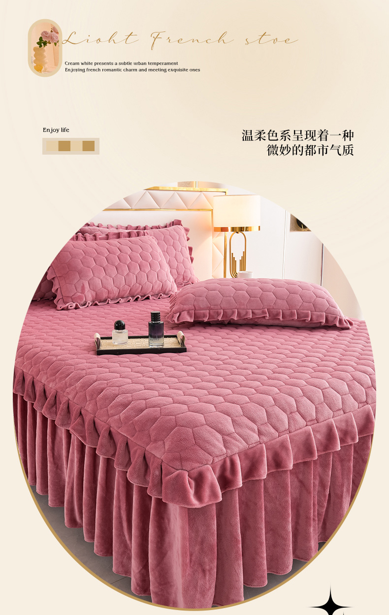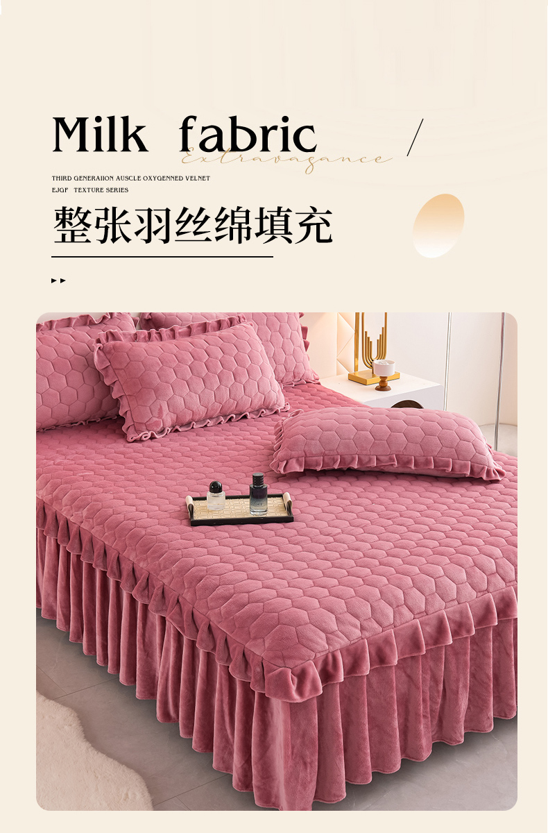 商品名称:优家居工厂店 2026新款纯色韩版花边牛奶绒夹棉床裙床罩加厚外贸直播 盛世-豆沙
