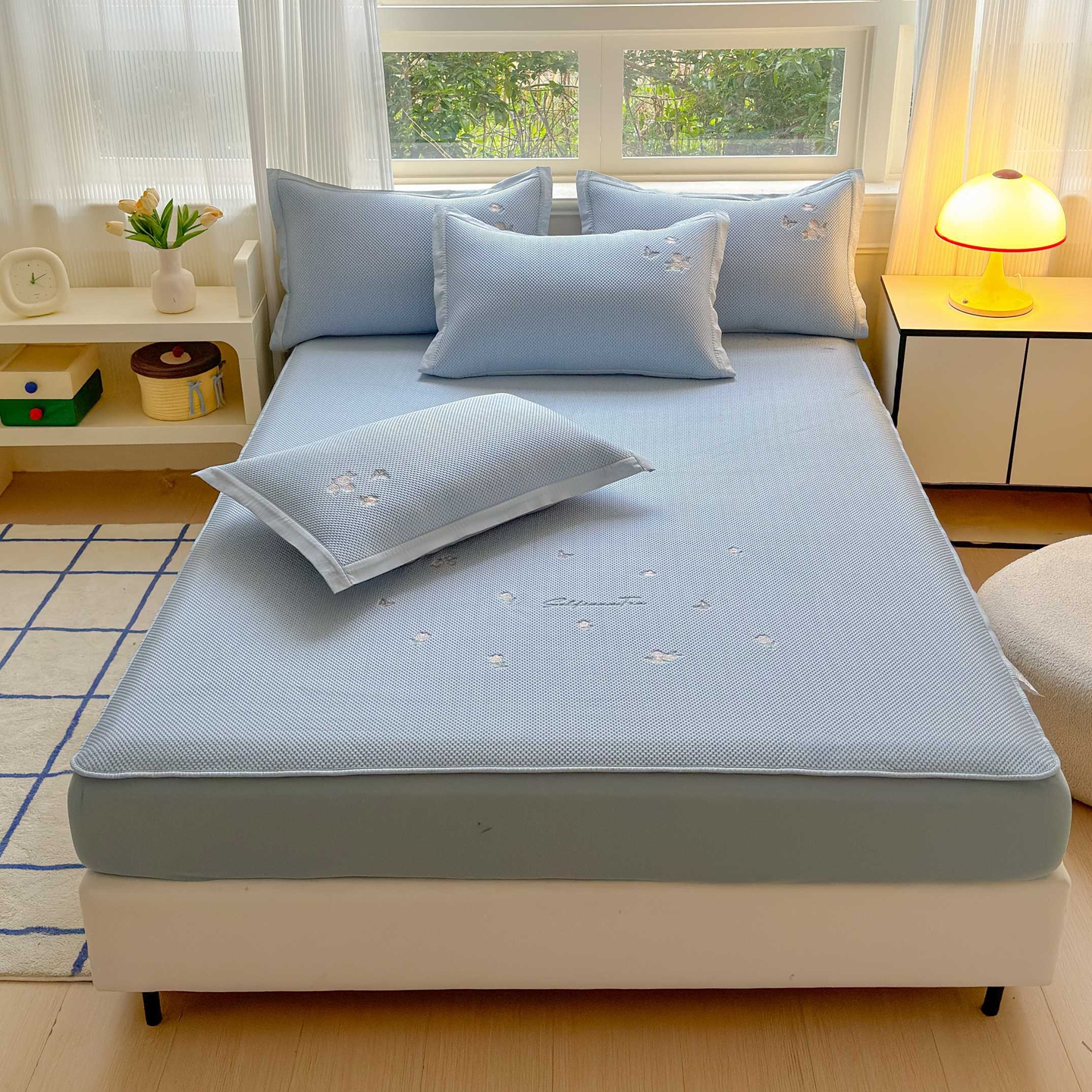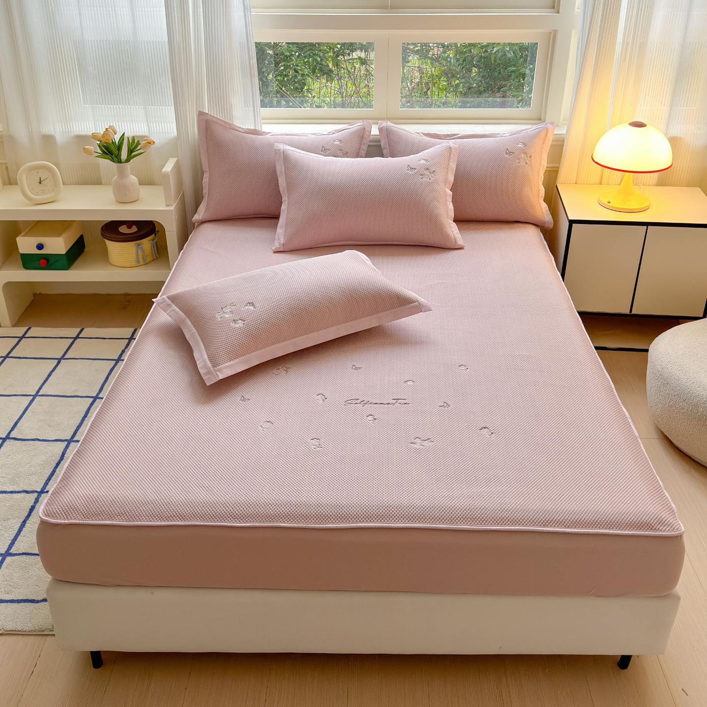 (总)席匠 2026新款直角包边绣花玫瑰床笠款凉席席子凉席三件套,粉色,灰色,蓝色,绿色