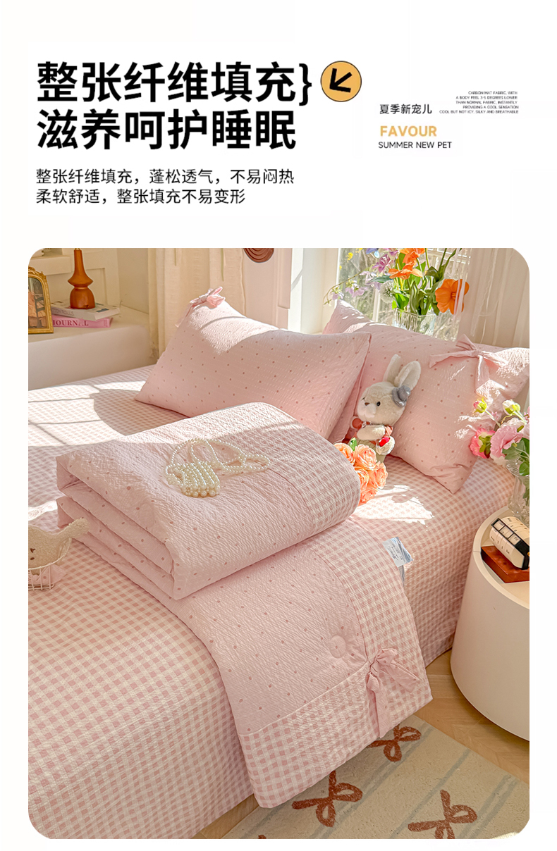 被子 > 夏被 > 爱彼家纺 2026春夏新款提花泡芙棉拼角蝴蝶结软乎乎的撸猫感单夏被夏被四件套-甜莓气泡 泡芙夏被-奶粉波点