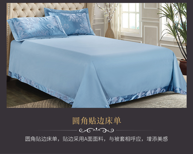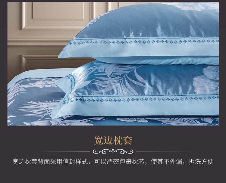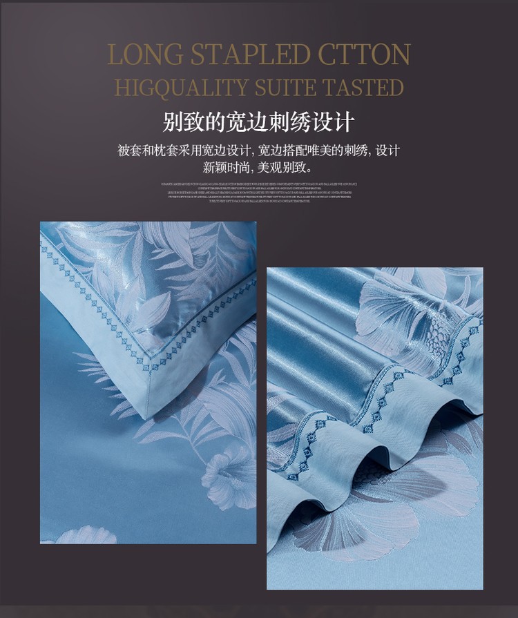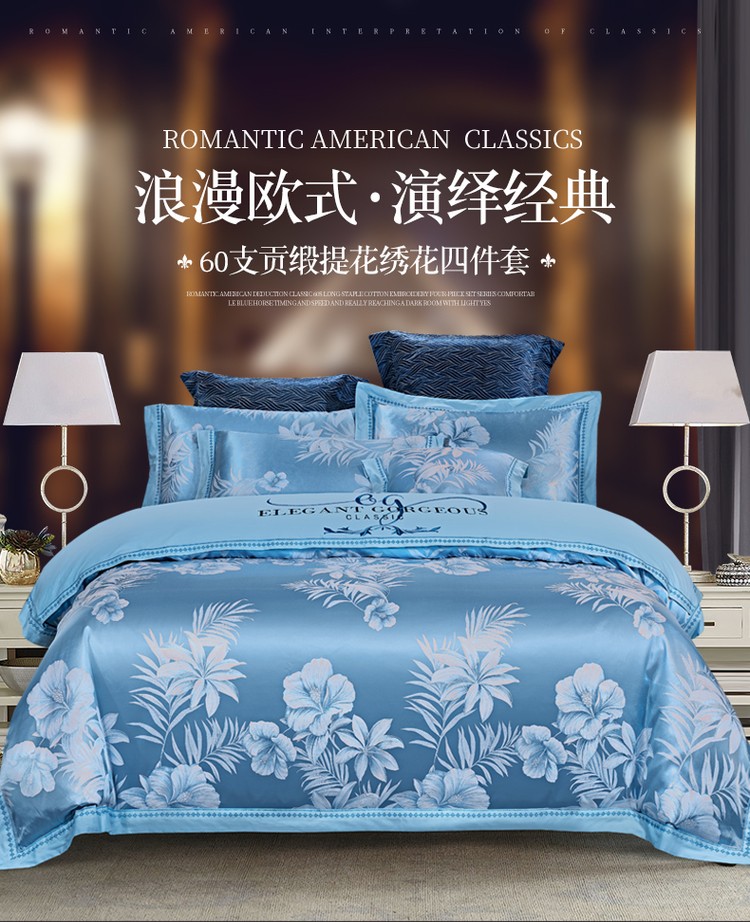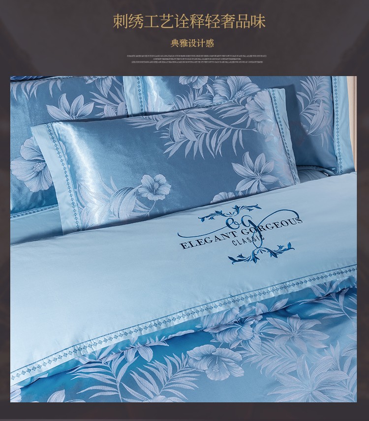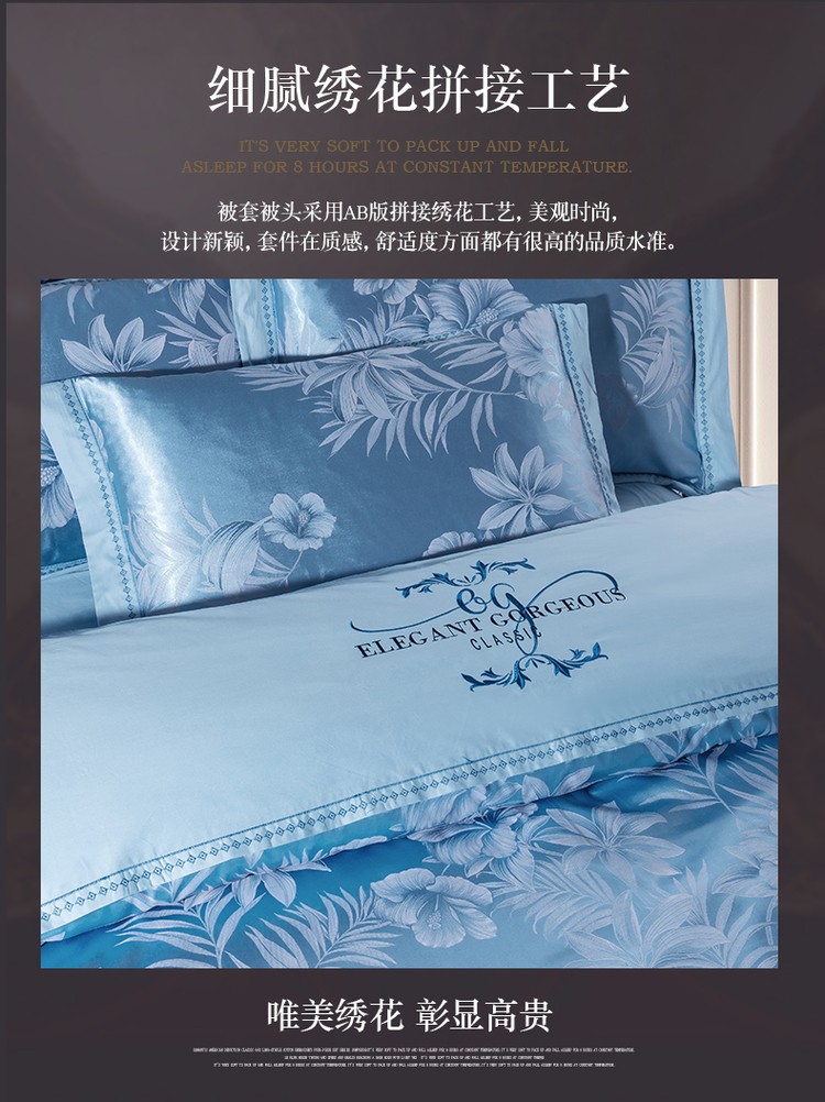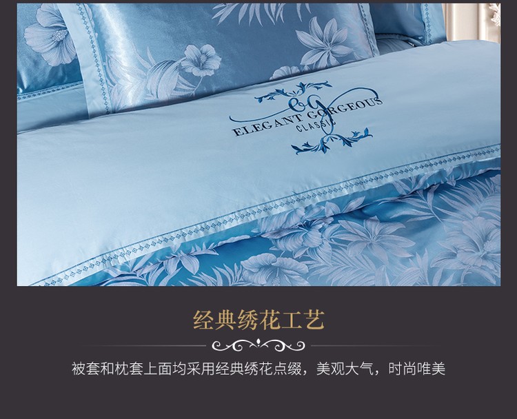 柔觉家纺 天丝刺绣贡缎提花全棉四件套,柔梦-海蓝
