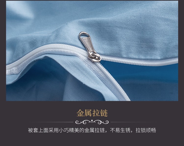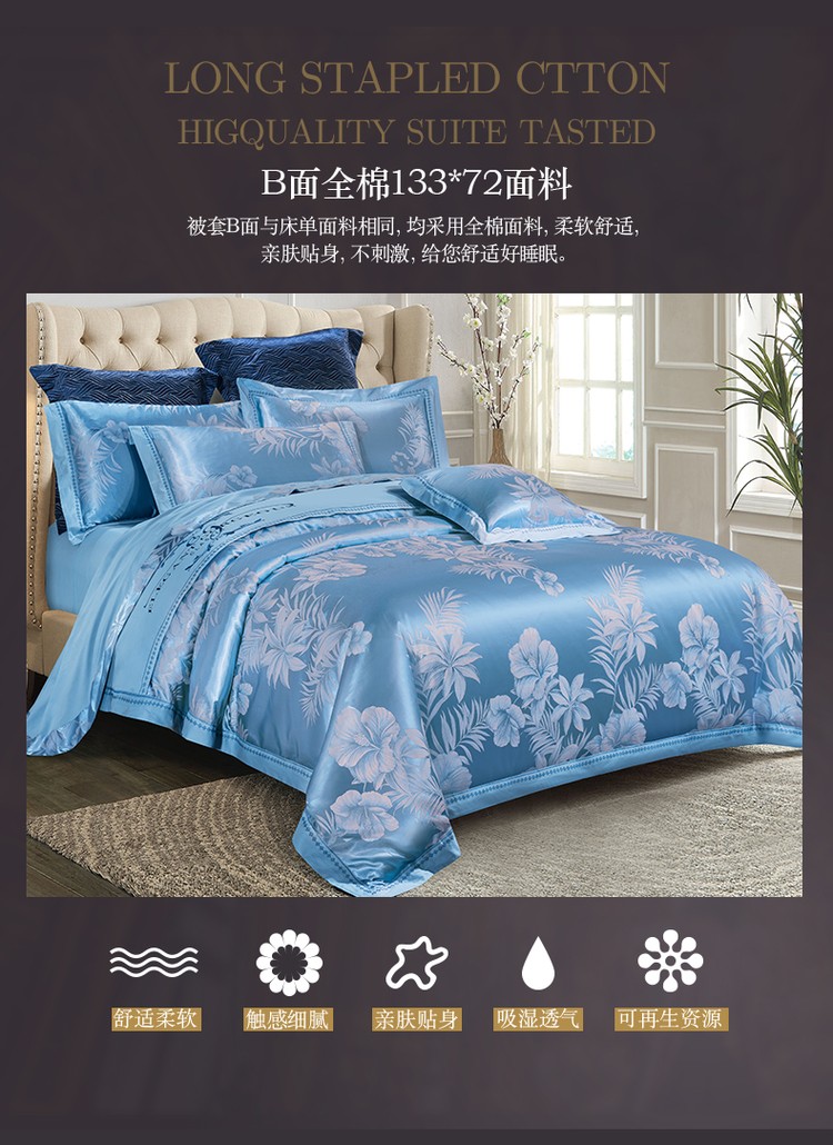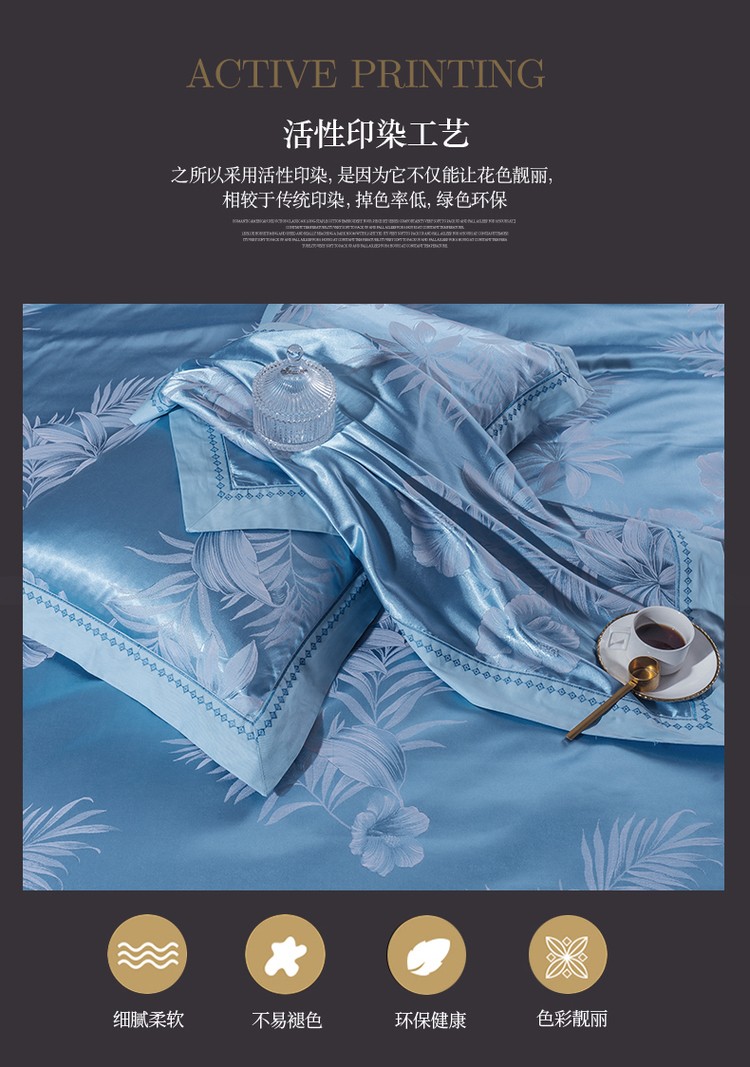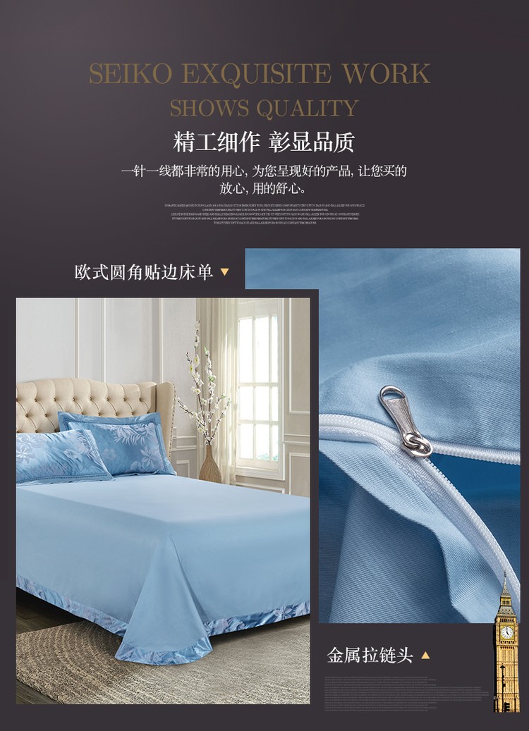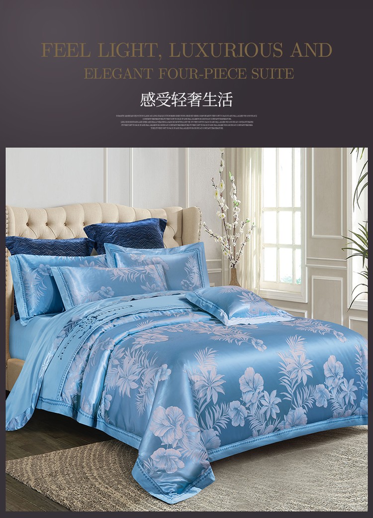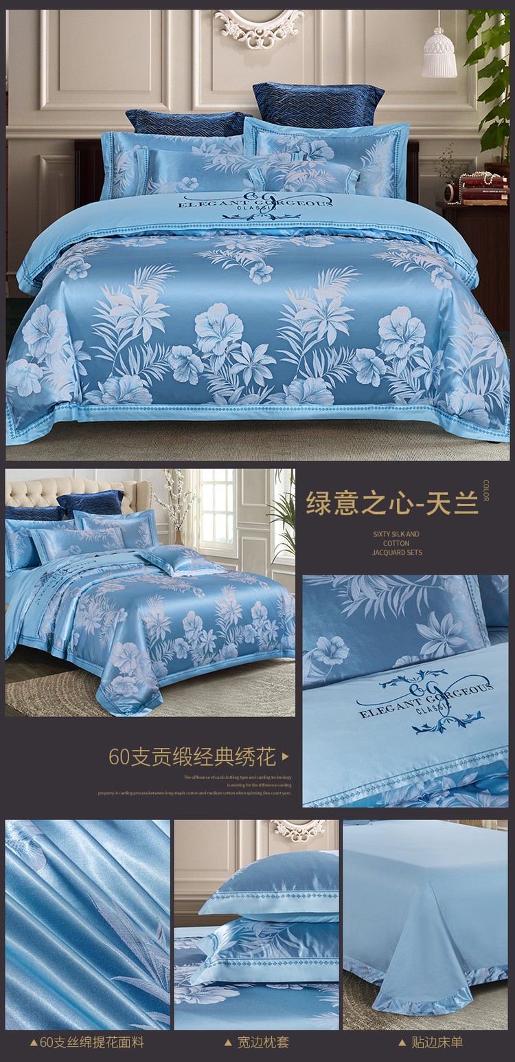 柔觉家纺 天丝刺绣贡缎提花全棉四件套,柔梦-海蓝