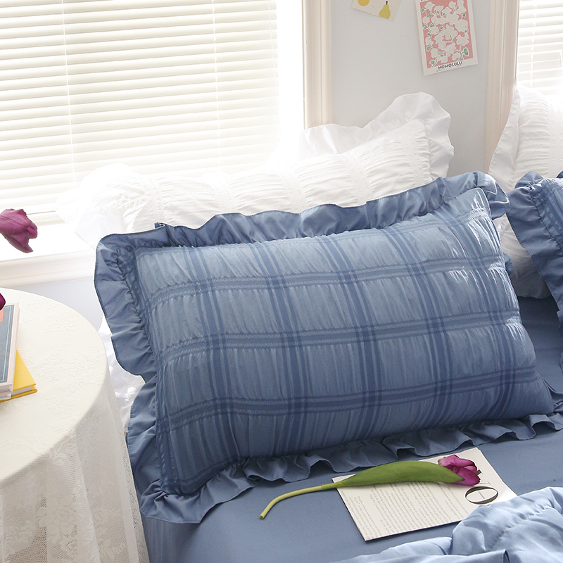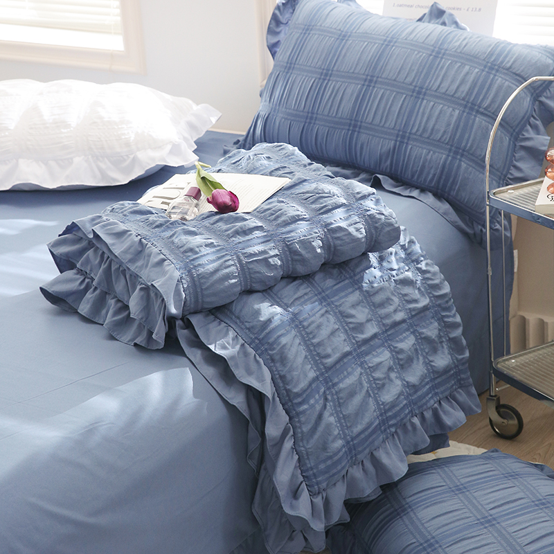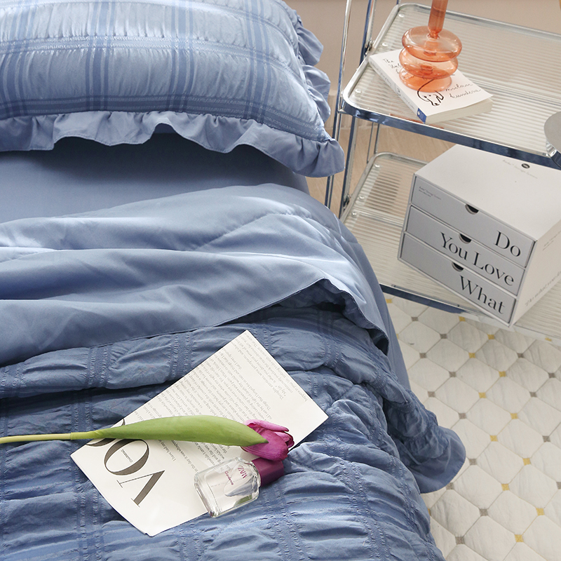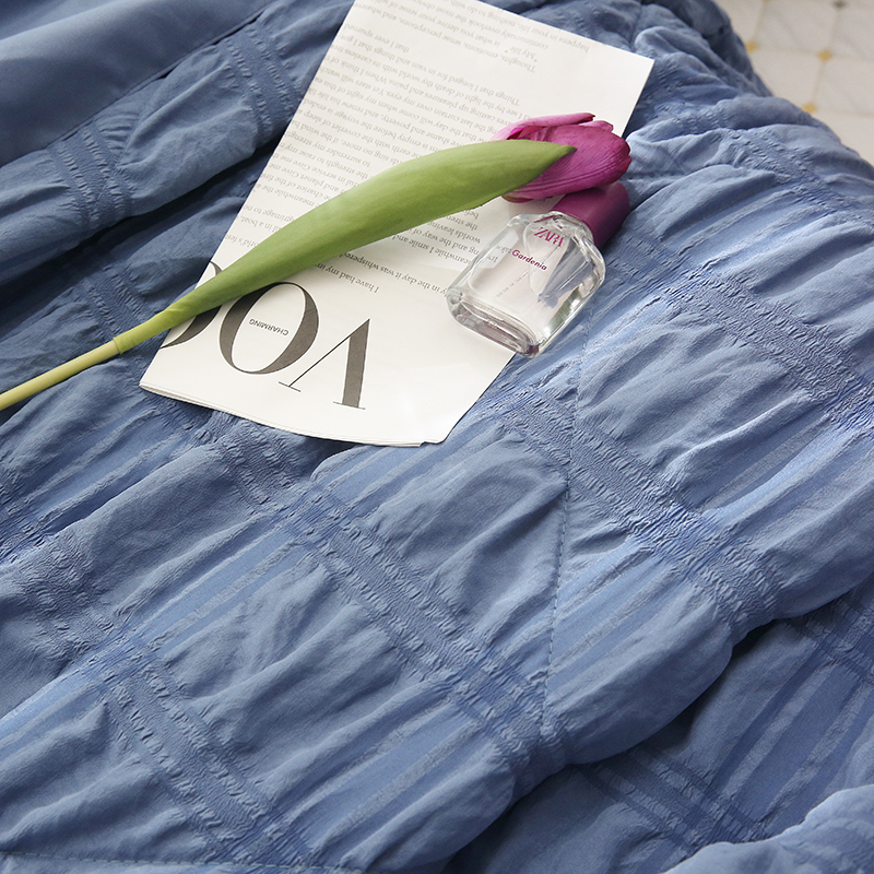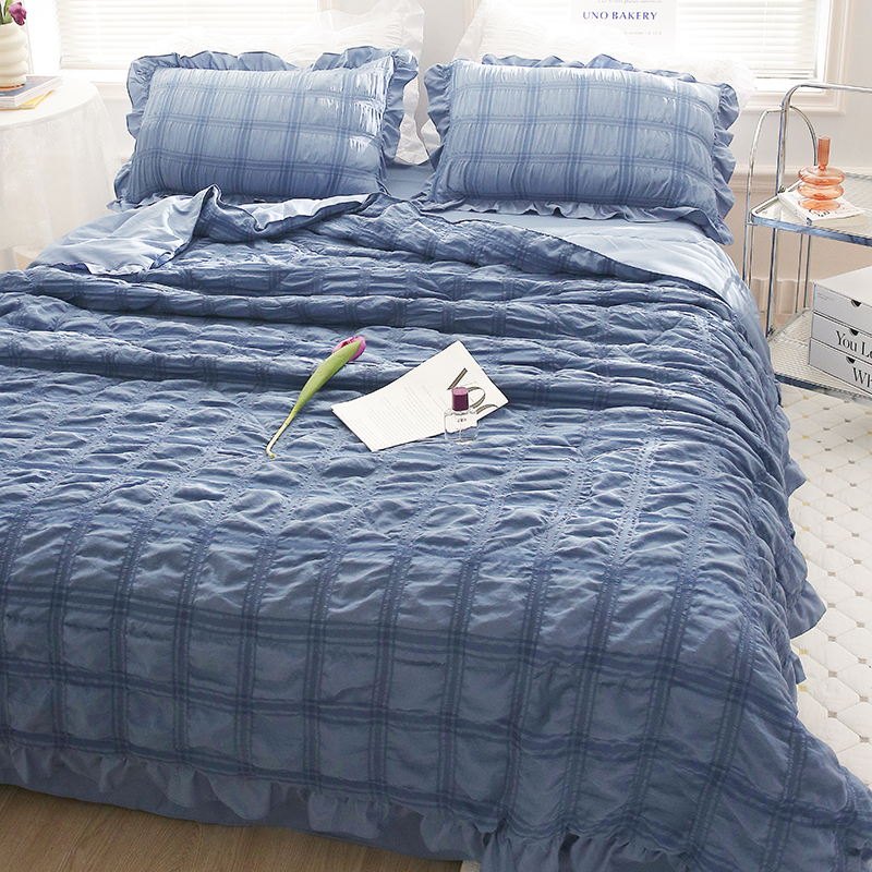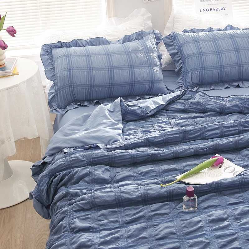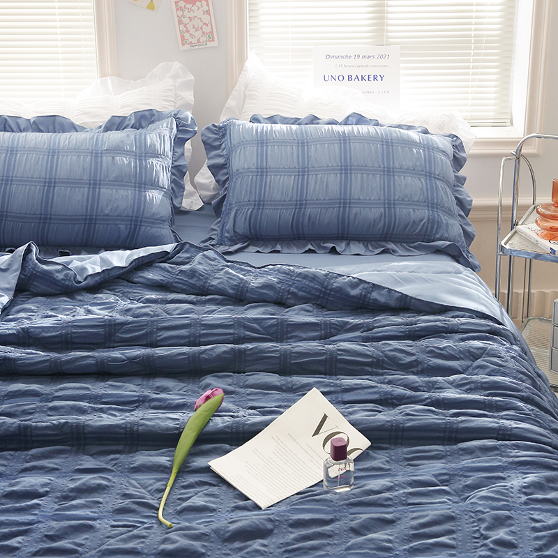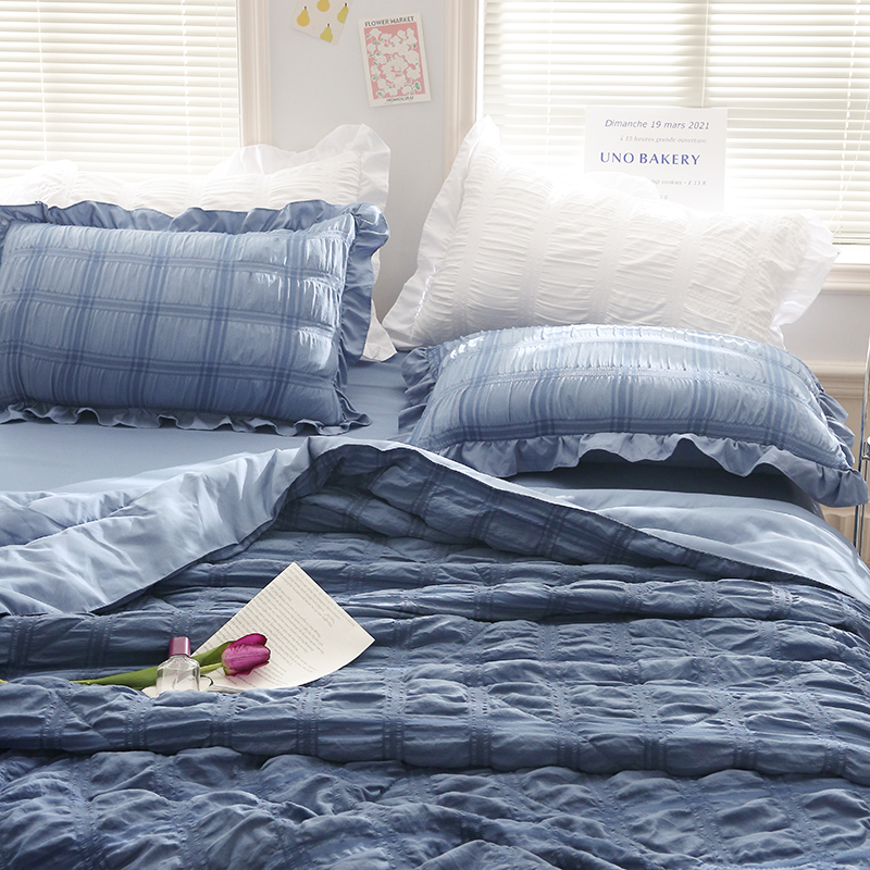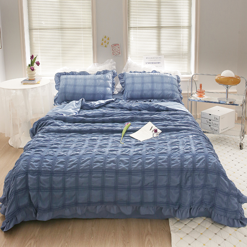 仟网汇 2025新款韩版简约方格泡泡纱四件套 夏被四件套 蔚蓝