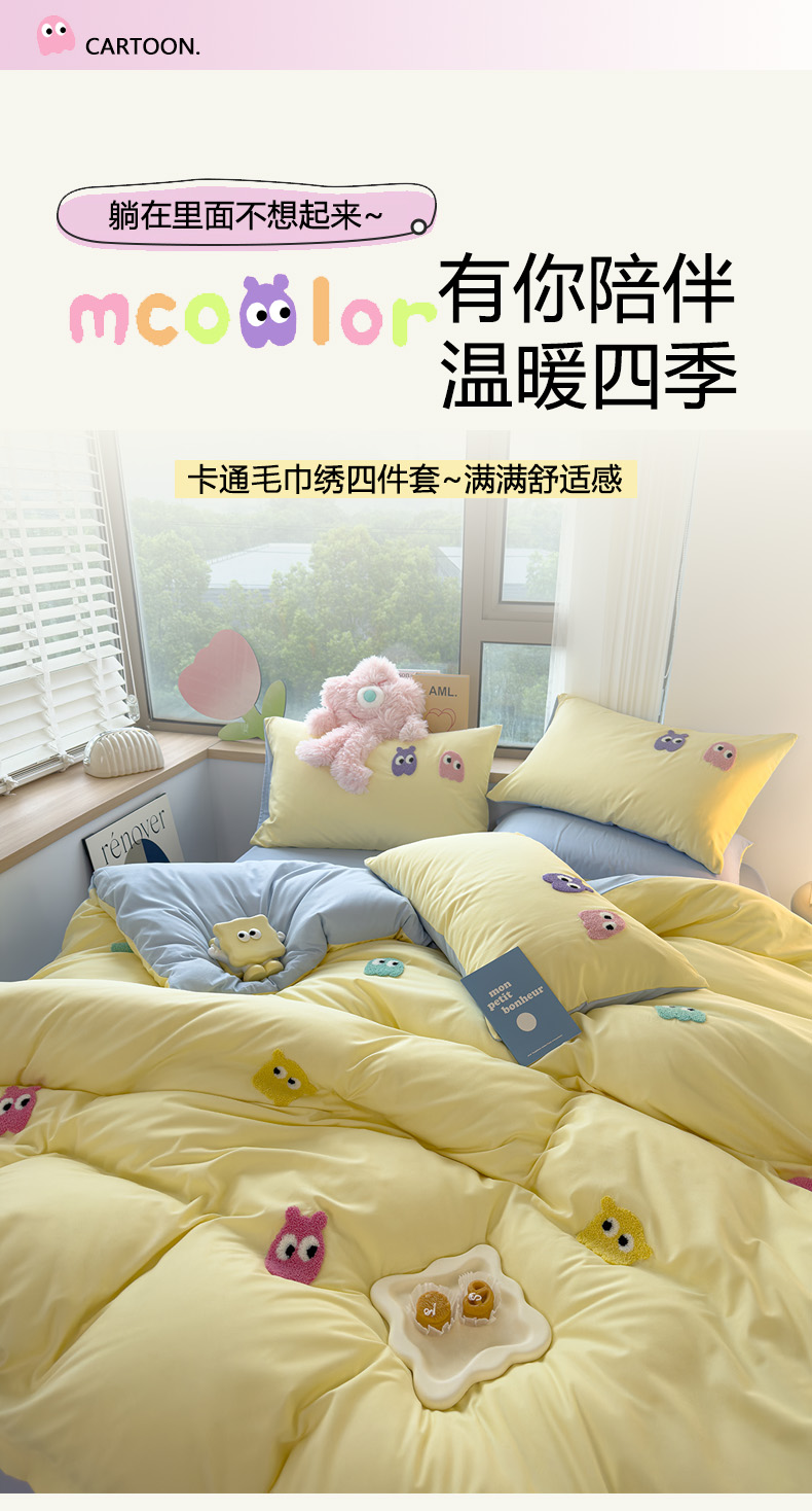 当前位置: 91家纺网 > 商品网购 > 床品套件 > 四件套 > 毛巾绣四件套 > 曼谷 年新款多巴胺毛巾绣四件套柔软磨毛床上用品水洗棉套件 多巴胺-奶黄浅蓝