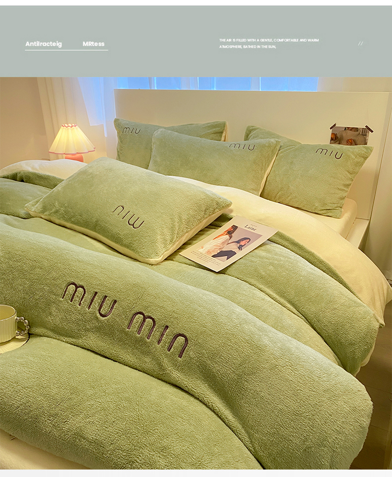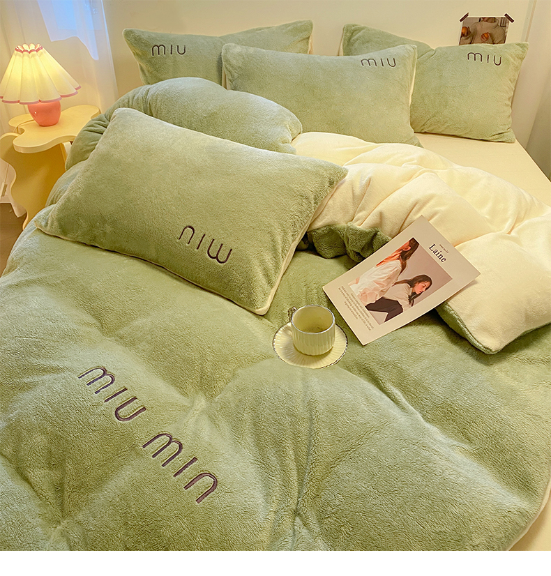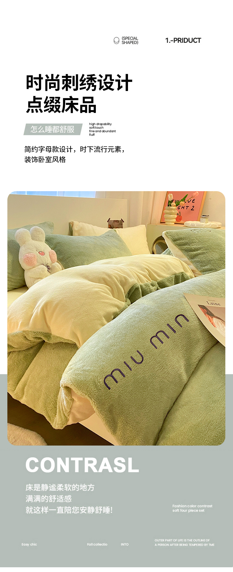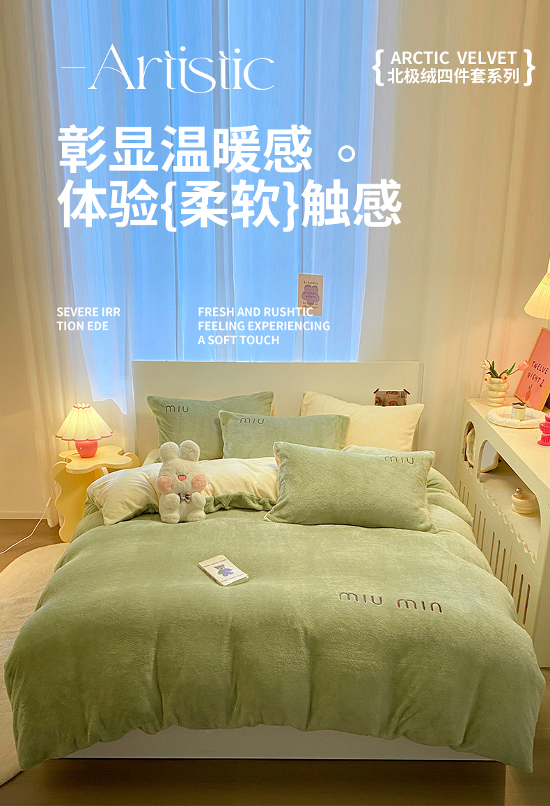 当前位置: 91家纺网 > 商品网购 > 床品套件 > 四件套 > 牛奶绒四件套 > 启程家纺 2024新款A类加厚北极绒拼牛奶绒字母刺绣四件套 北极绒-浅草绿+奶油黄