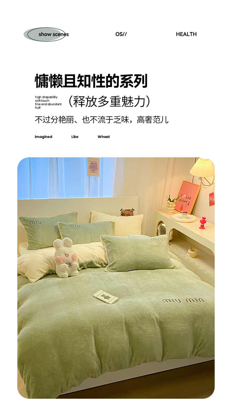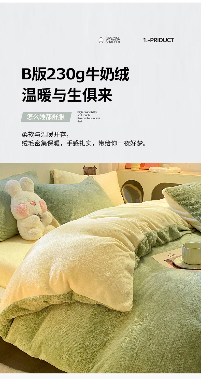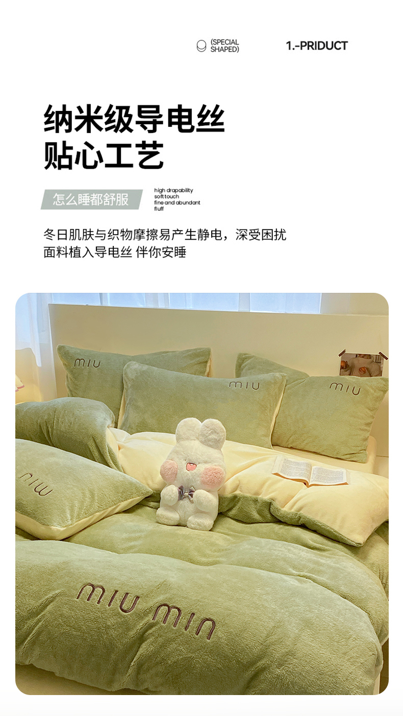 当前位置: 91家纺网 > 商品网购 > 床品套件 > 四件套 > 牛奶绒四件套 > 启程家纺 2024新款A类加厚北极绒拼牛奶绒字母刺绣四件套 北极绒-浅草绿+奶油黄