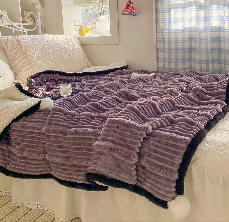 潮邦 2025秋冬子母抽条羊羔绒球毯 子母抽条球毯-紫色