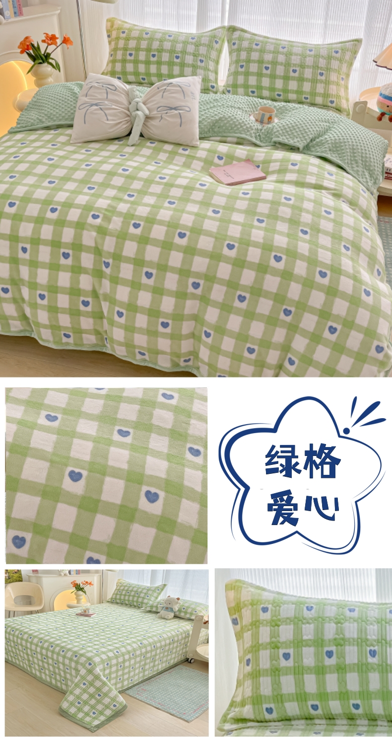 • 91家纺网 家纺一手货源 找家纺 慕晨 2024新款高克重A类牛奶绒印花豆豆绒夹棉单床盖三件被套四件套 绿格爱心