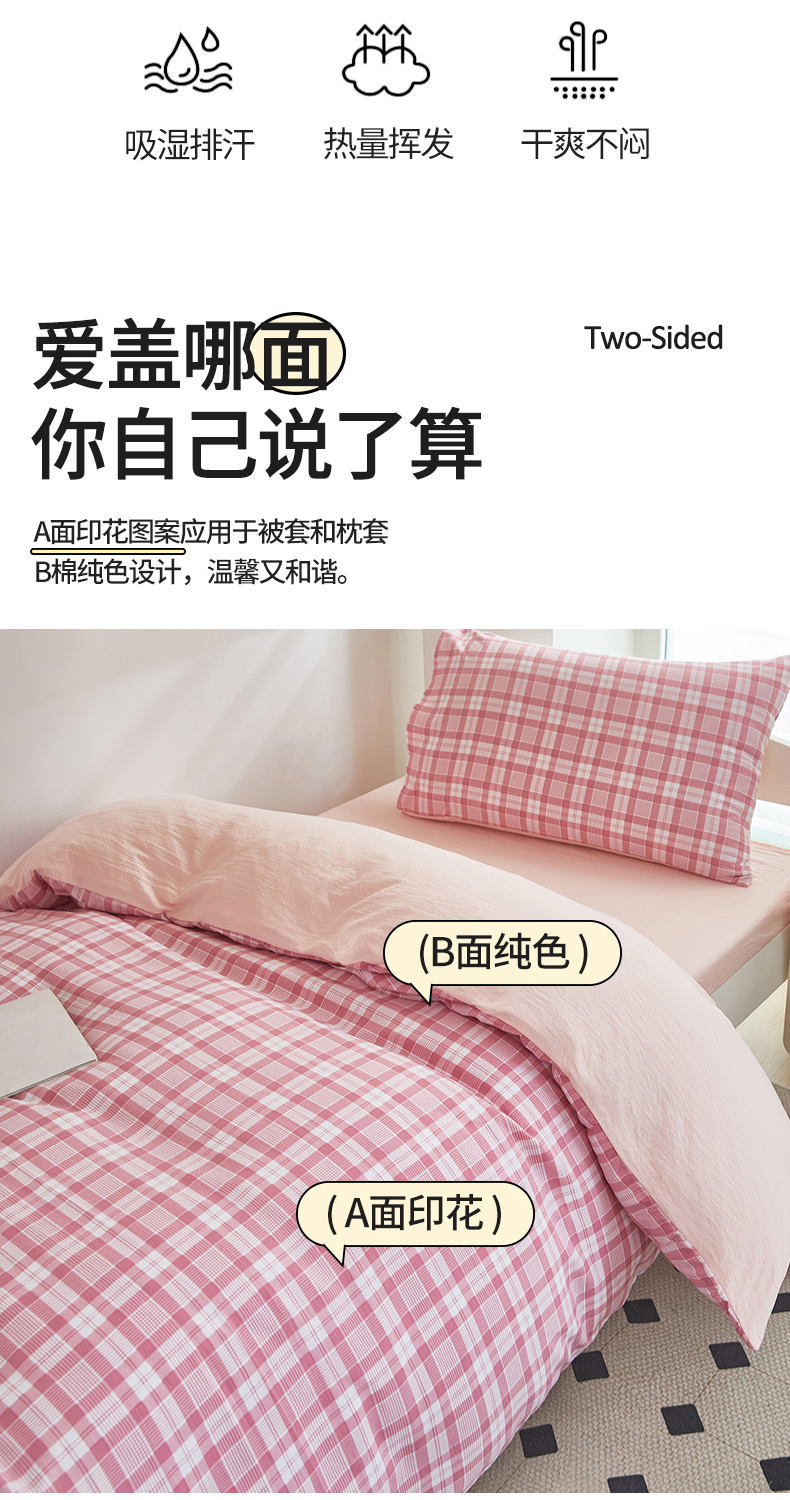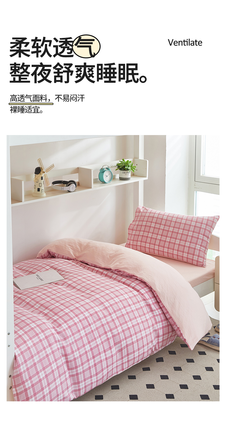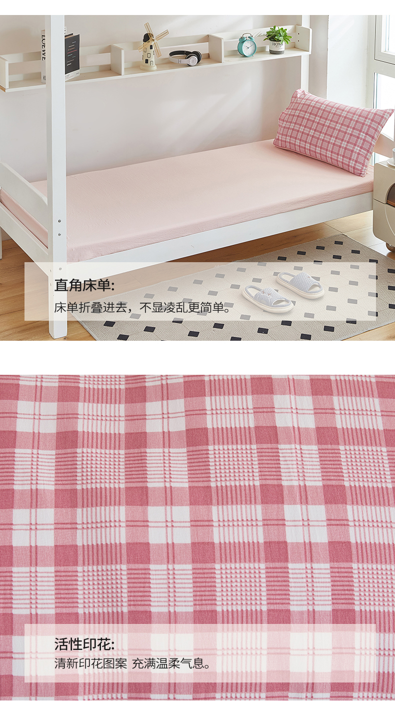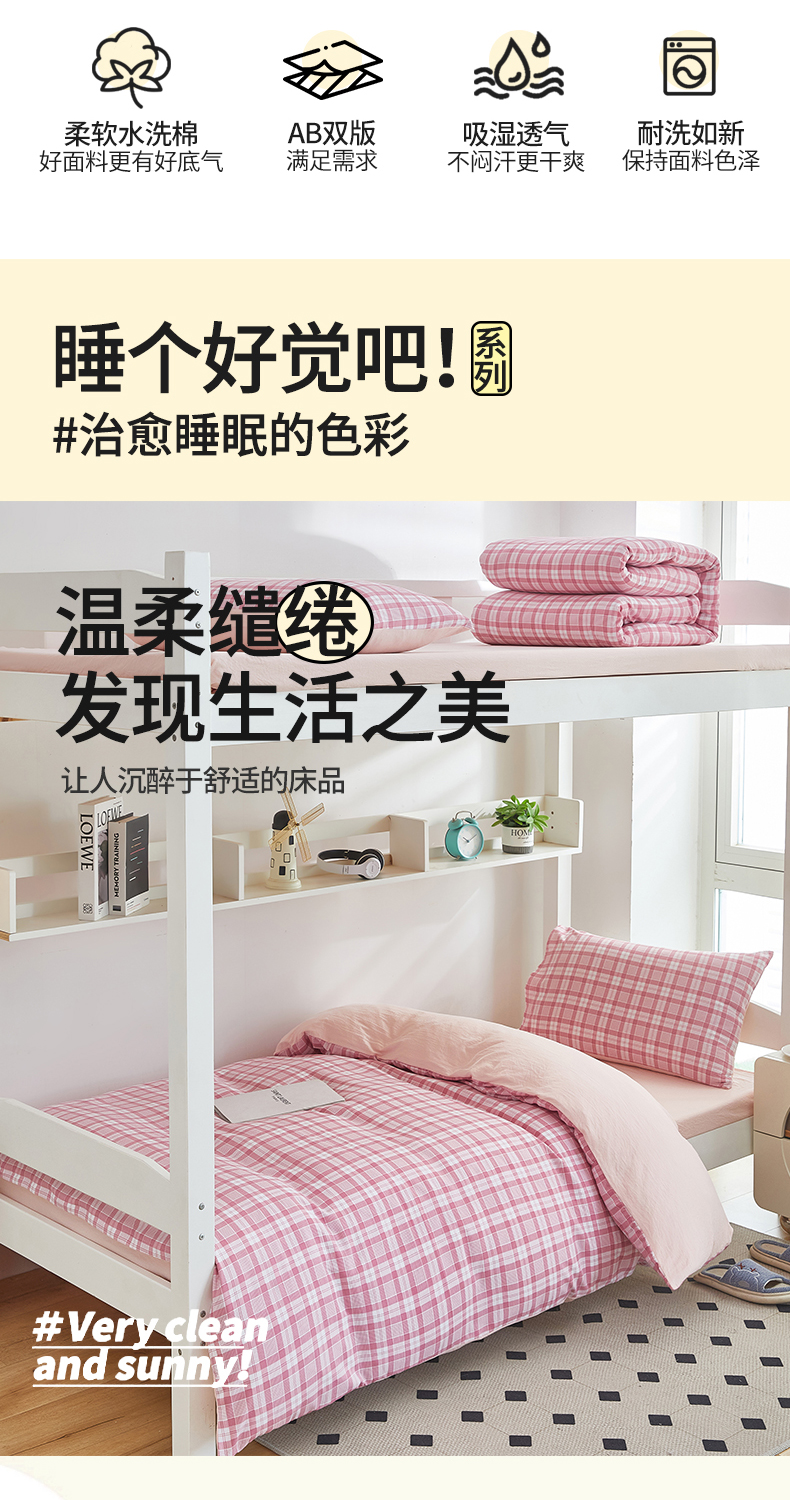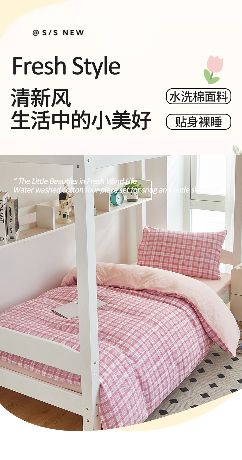(总)恒科家纺 2025新款亲肤舒适小清新水洗棉四件套学生三件套-学生款宿舍三件套,格韵粉,蜜粉格,莫妮粉,莫妮兰,品格