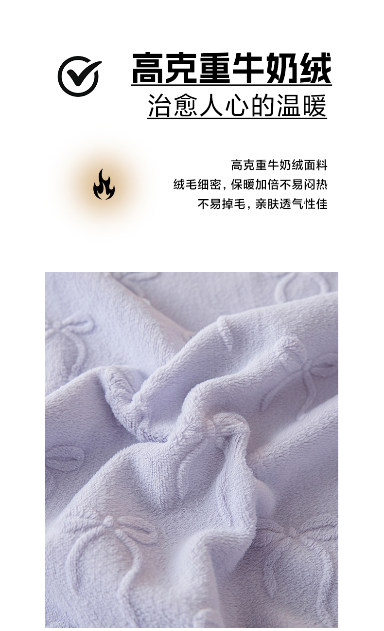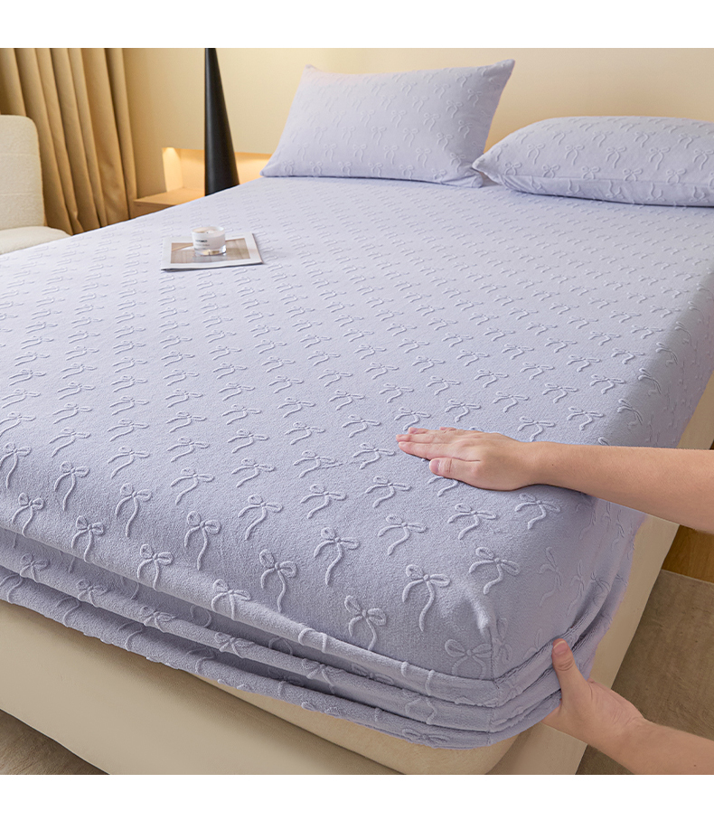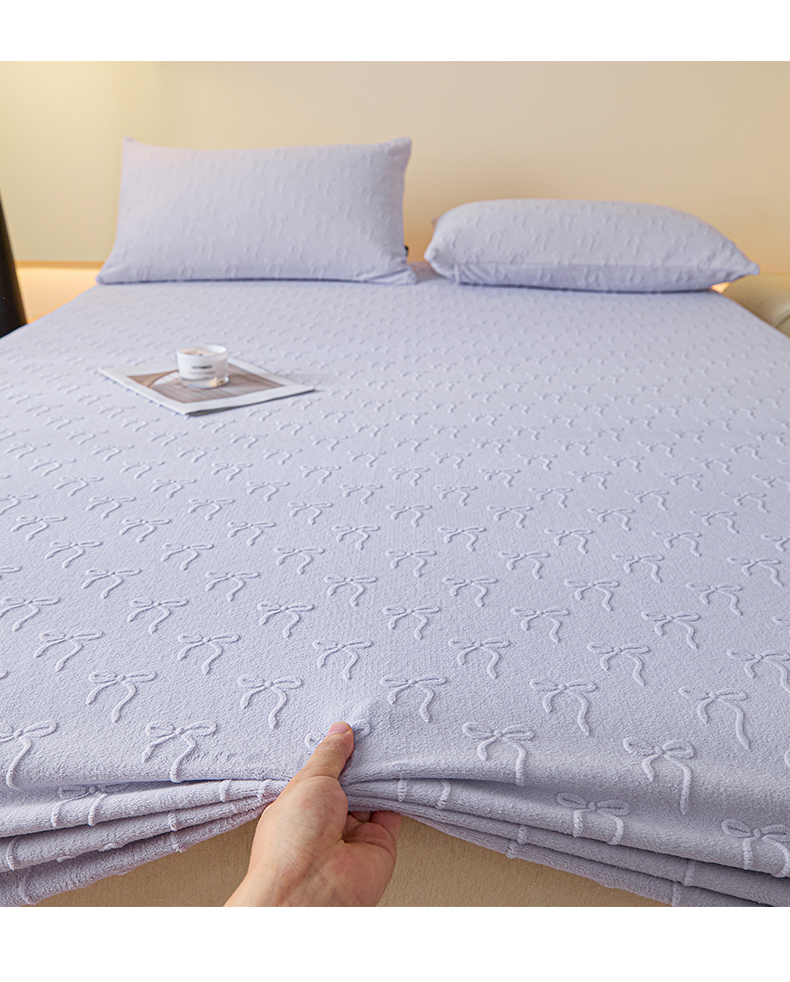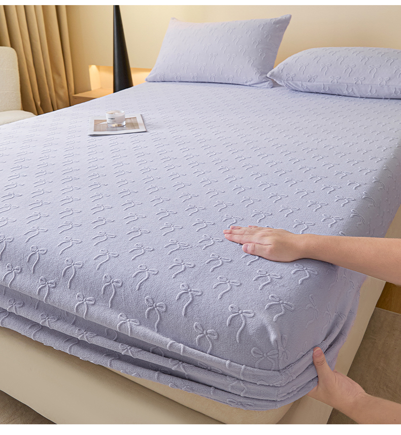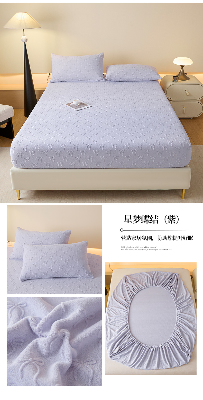 • 91家纺网 家纺一手货源 找家纺 乐美家纺 2025新款A类高克重牛奶绒雕花床笠三件套 星梦蝶结(紫)