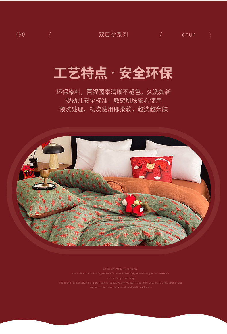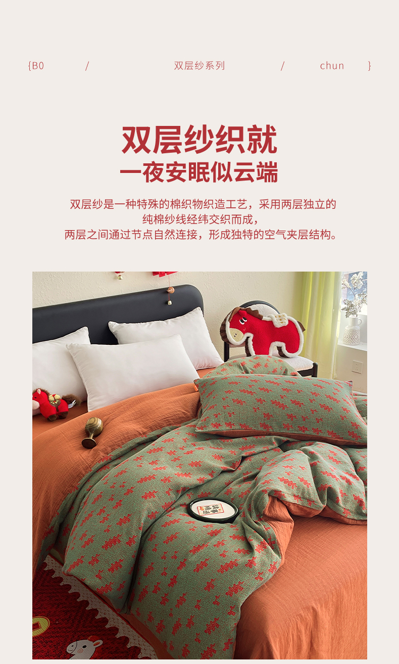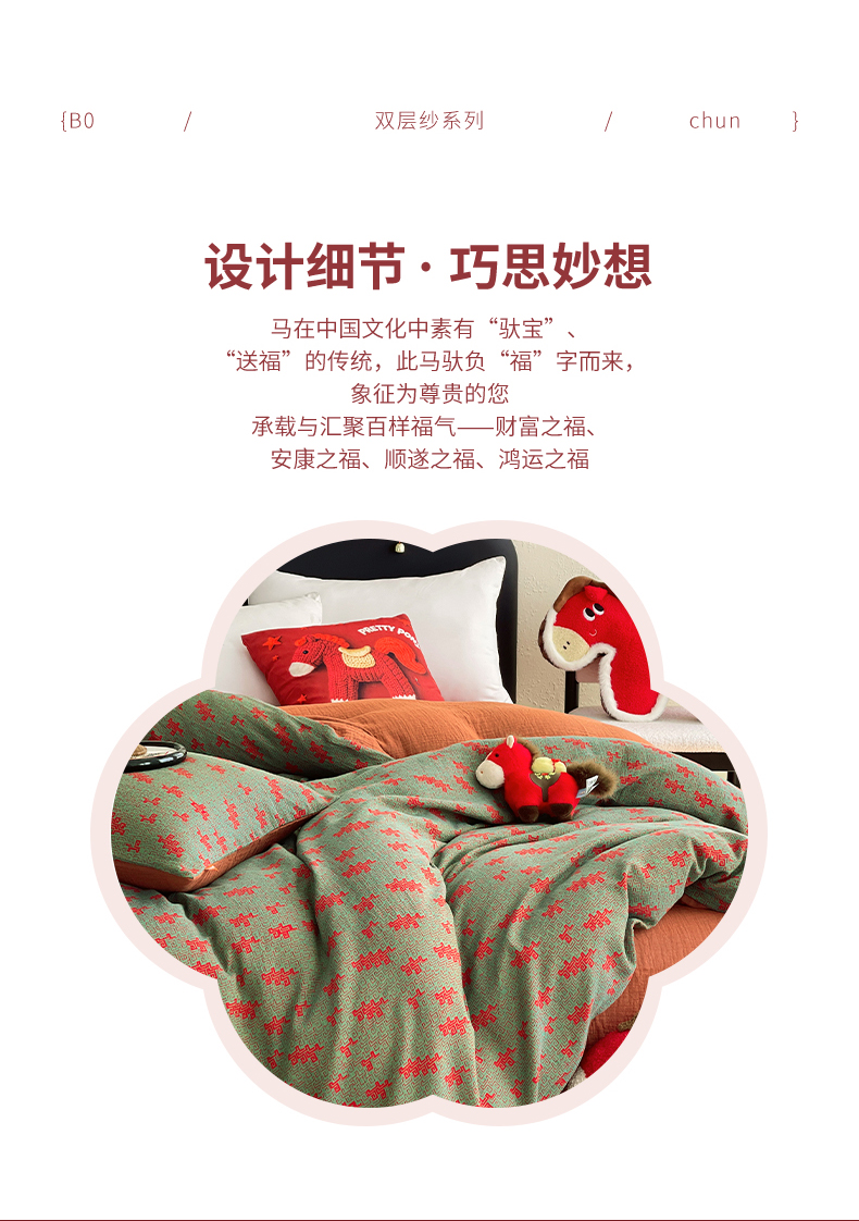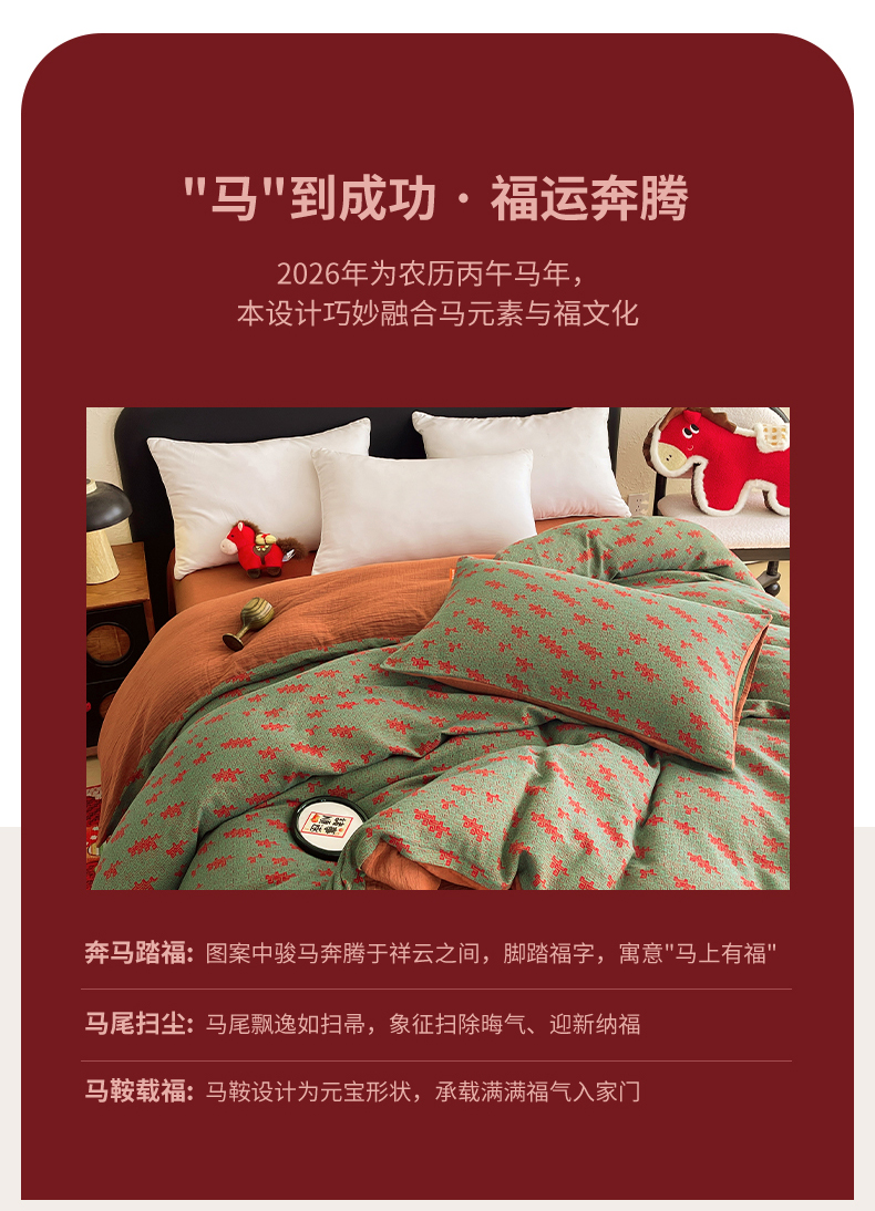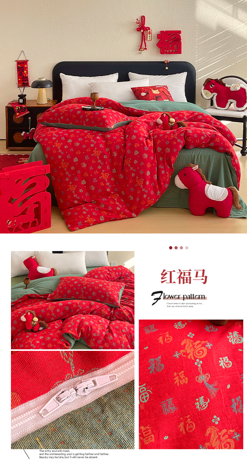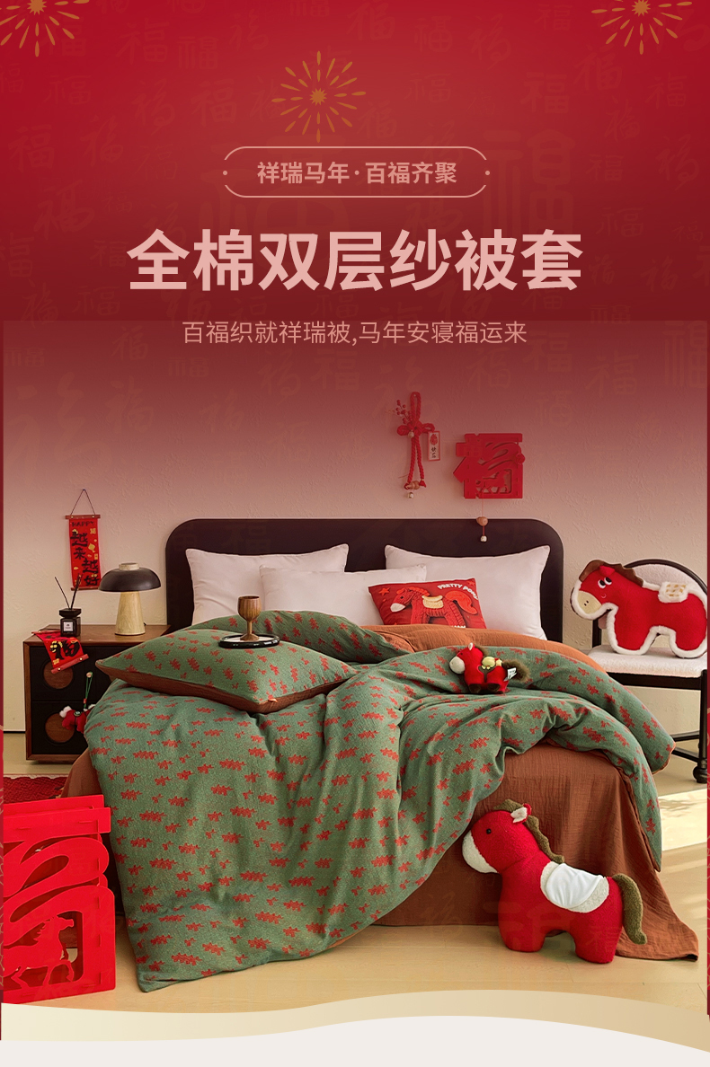 (总)春皖家纺 2026新款全棉色织双层纱提花百福系列拉链款-四件套,红百福,红赤兔,红福马,绿赤兔,绿福马,红绝影,绿绝影