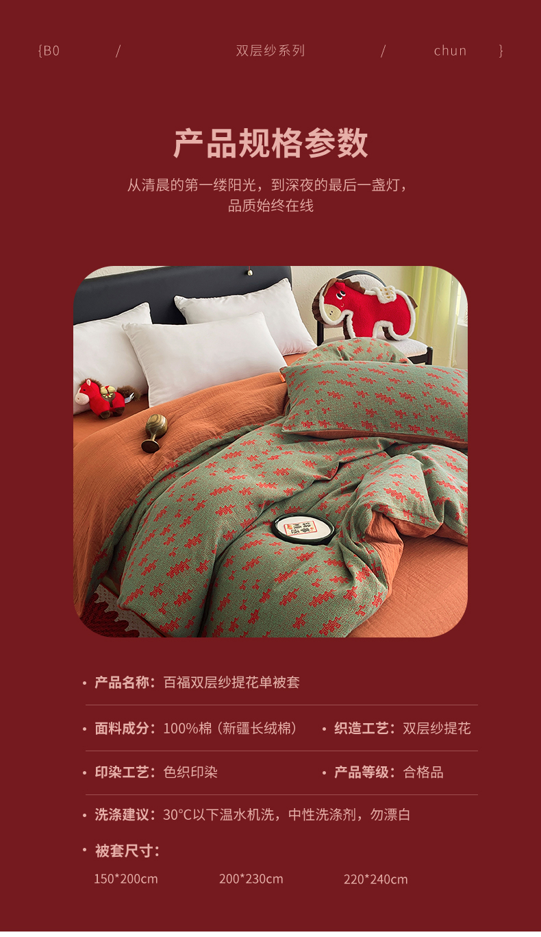春皖家纺 2026新款全棉色织双层纱提花百福系列拉链款-单被套 绿赤兔