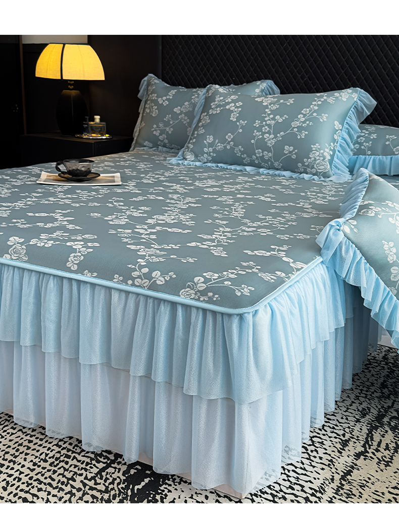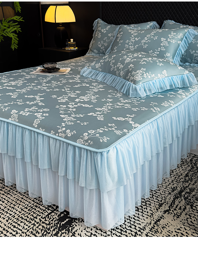 • 91家纺网 家纺一手货源 找家纺 家之硕家纺 2026春夏新款凉感提花床裙款凉席席子 蔷薇玫瑰--深蓝
