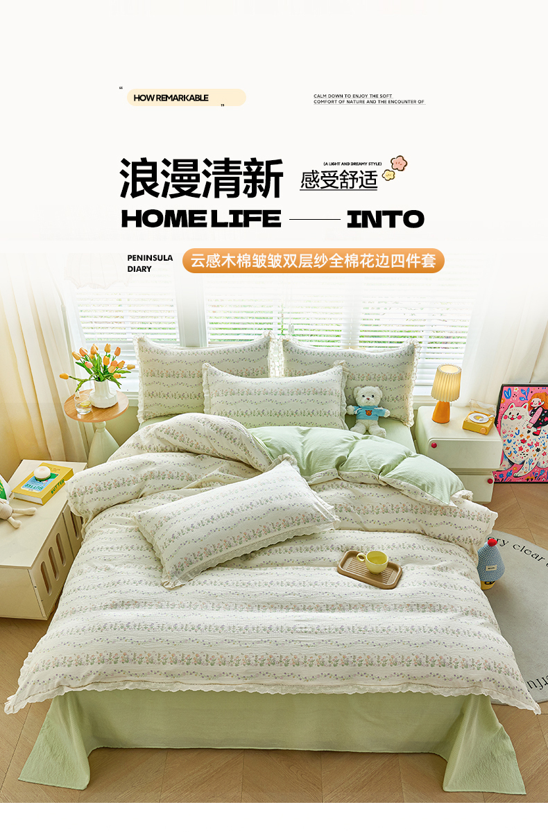当前位置: 91家纺网 > 商品网购 > 床品套件 > 四件套 > 其它四件套 > 钰锦珀家纺 2026春夏新款云感皱皱纱镂空花边三件套四件套 晚香玉