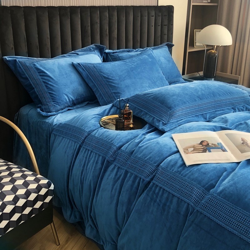 商品名称:榻尚 2021新款柔肤绒花边款四件套遇见系列 深蓝