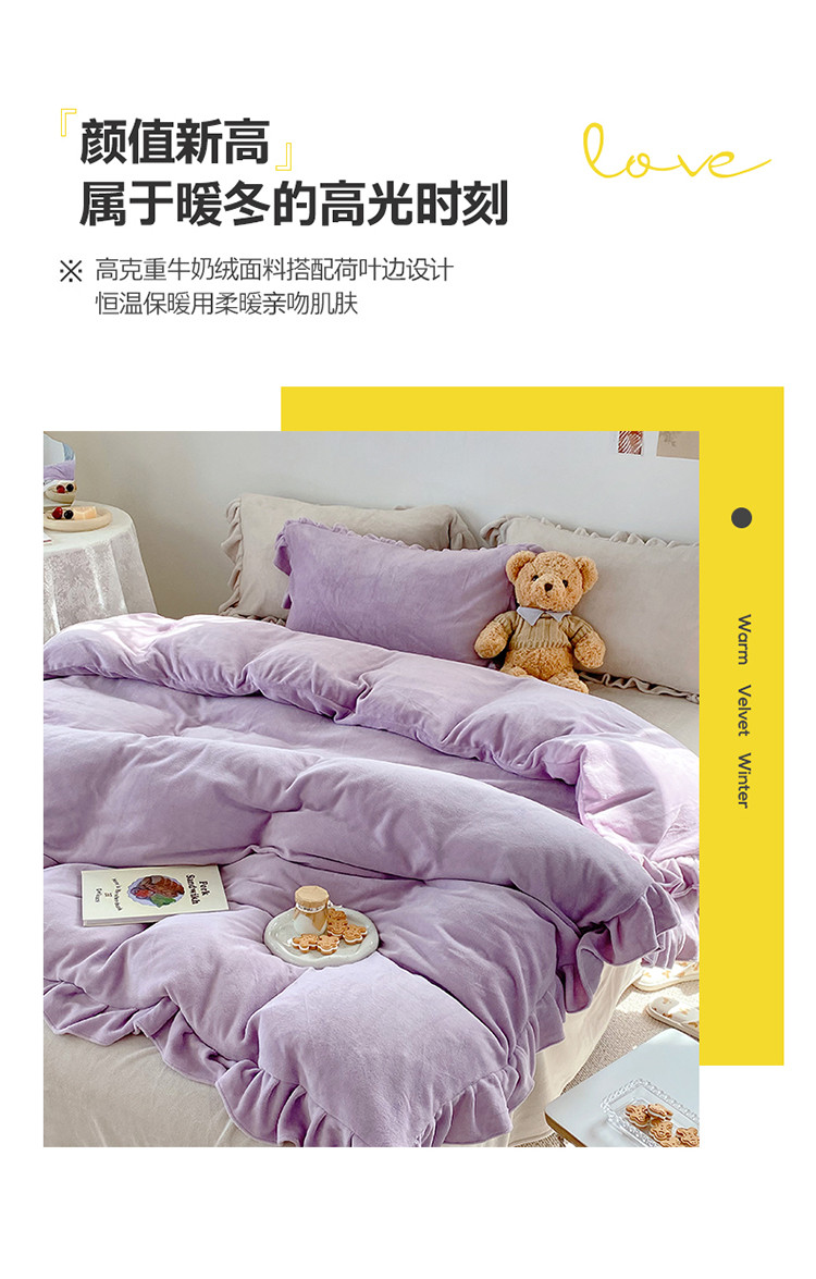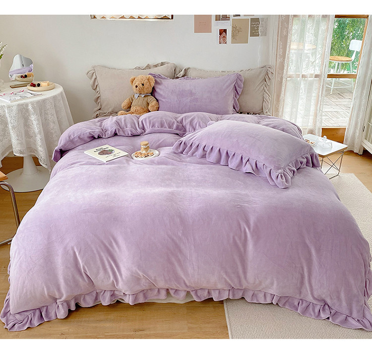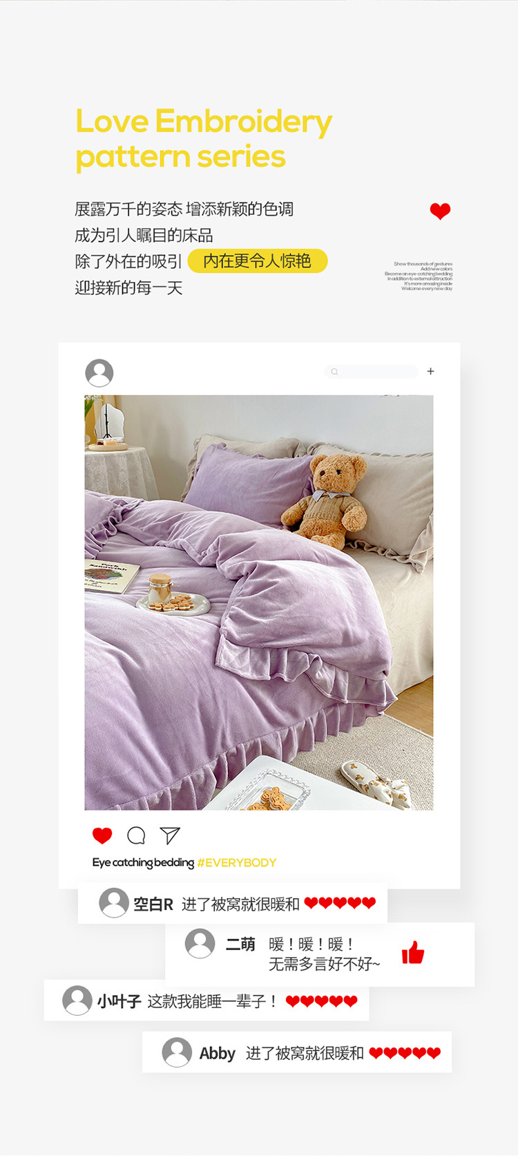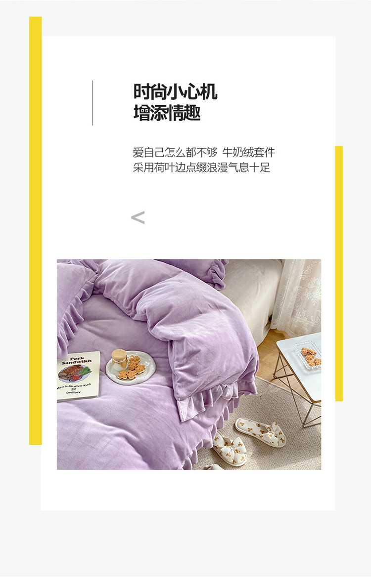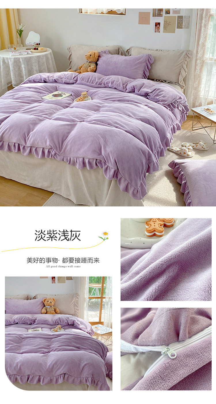当前位置: 91家纺网 > 商品网购 > 床品套件 > 四件套 > 牛奶绒四件套 > 六巷胡同 2021新款牛奶绒ins混搭花边款四件套 淡紫浅灰