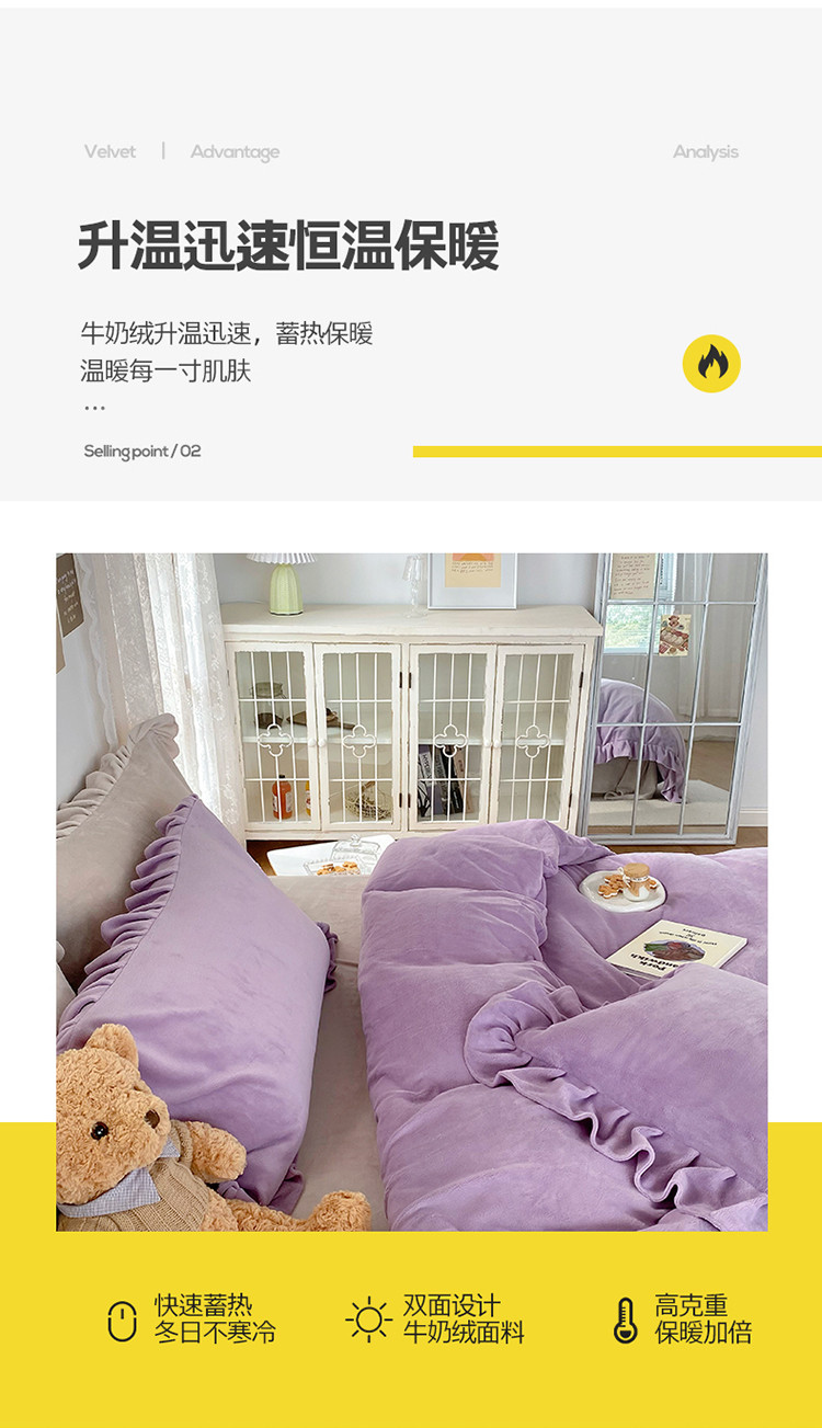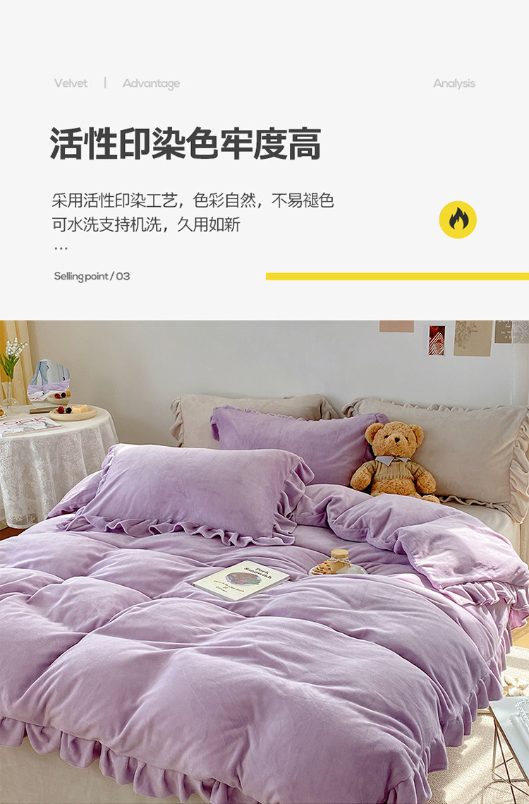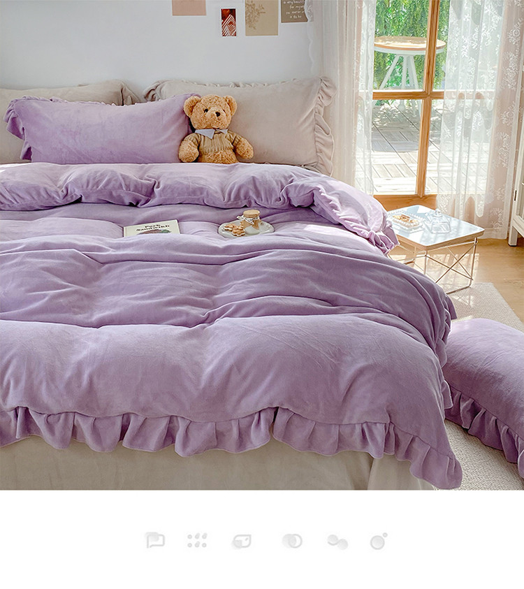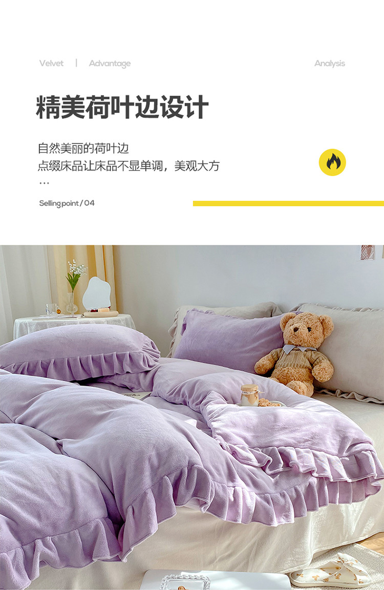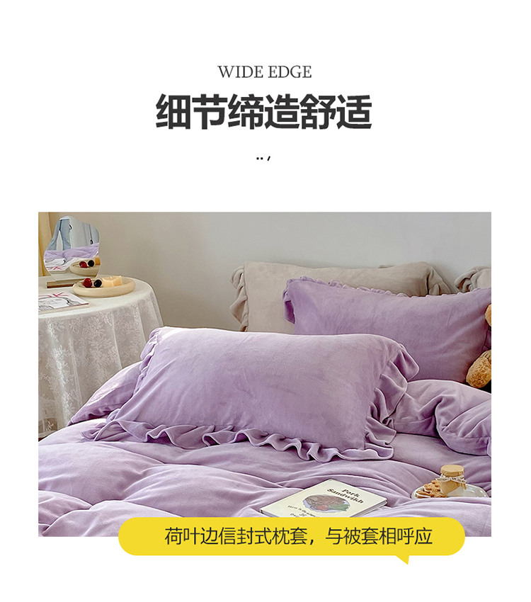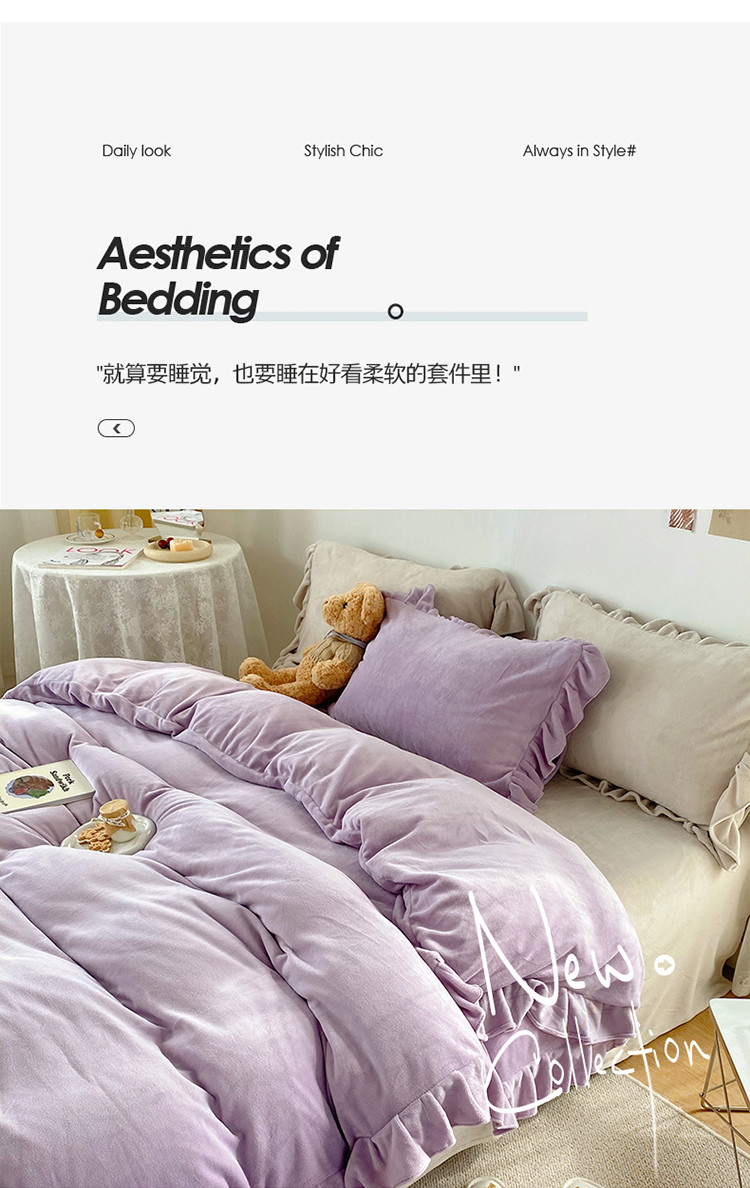 当前位置: 91家纺网 > 商品网购 > 床品套件 > 四件套 > 牛奶绒四件套 > 六巷胡同 2021新款牛奶绒ins混搭花边款四件套 淡紫浅灰