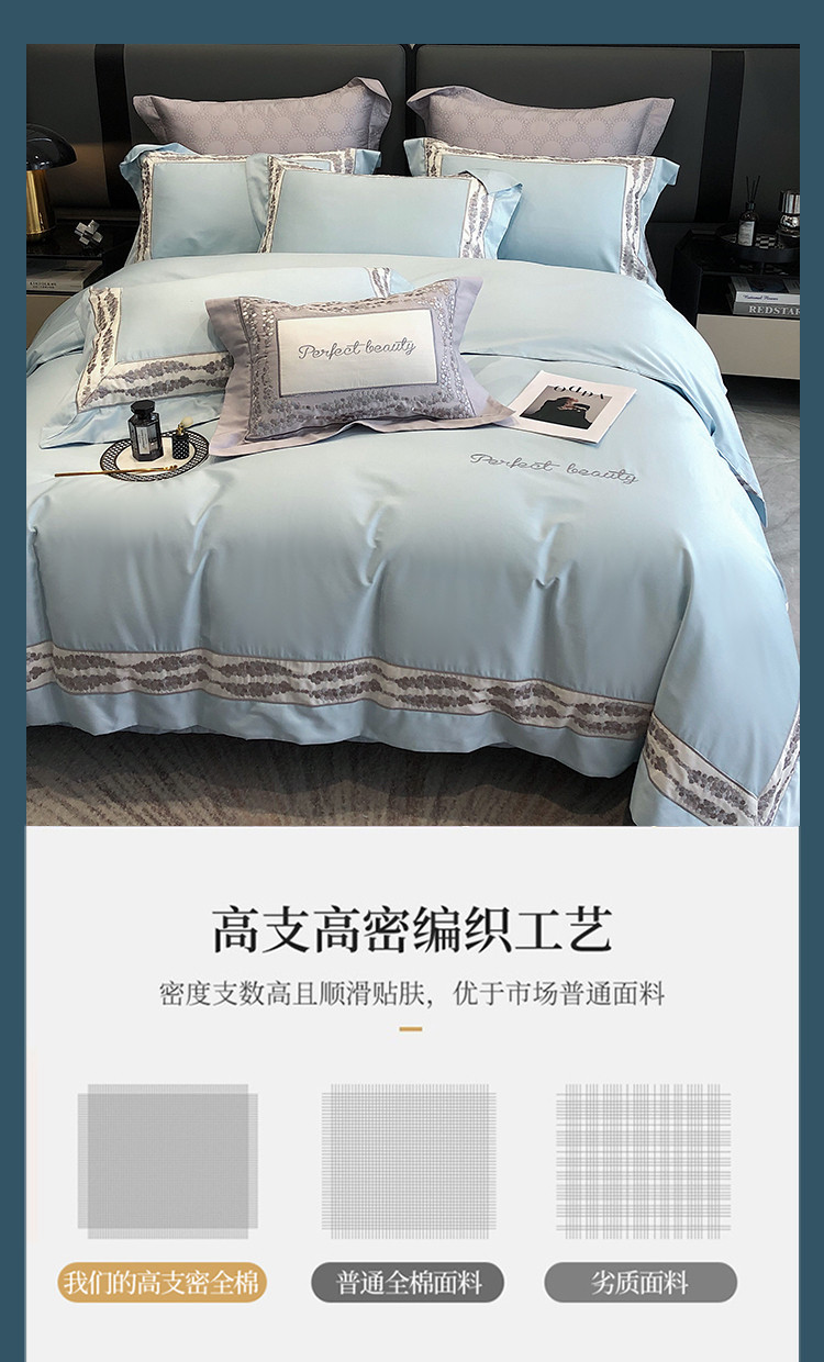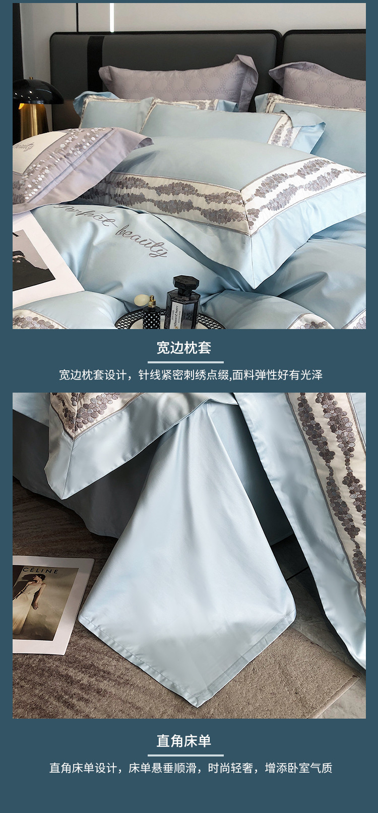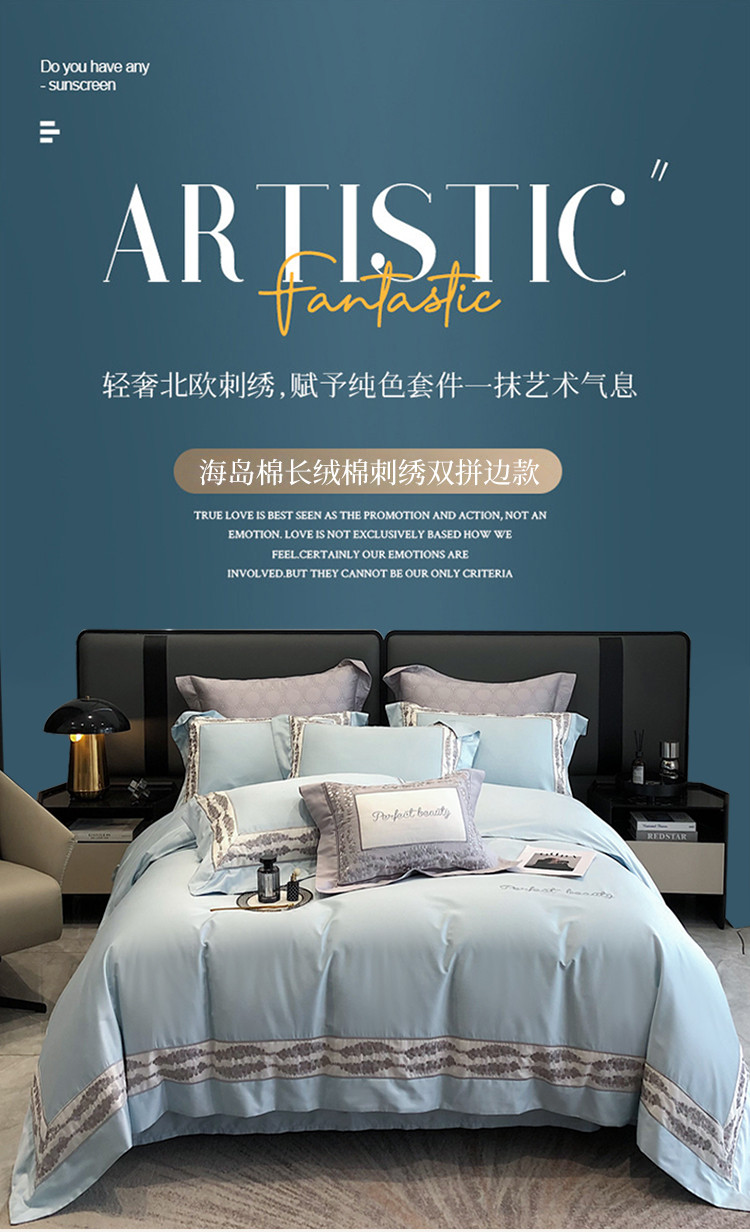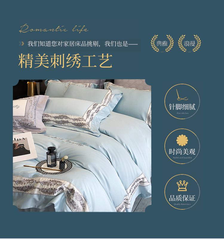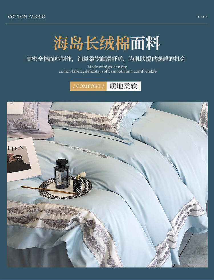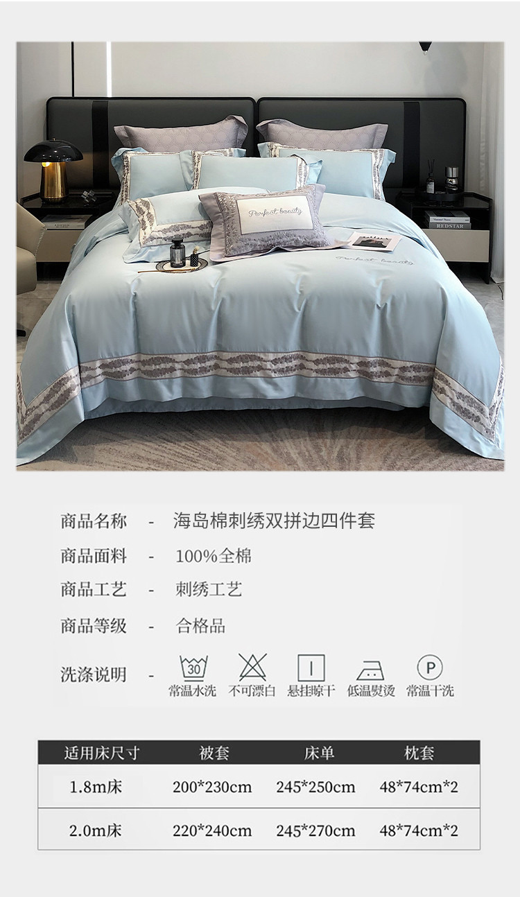 商品名称:娇逸家居 2022秋冬新品100支海岛棉刺绣双拼边款-波卡 西子蓝