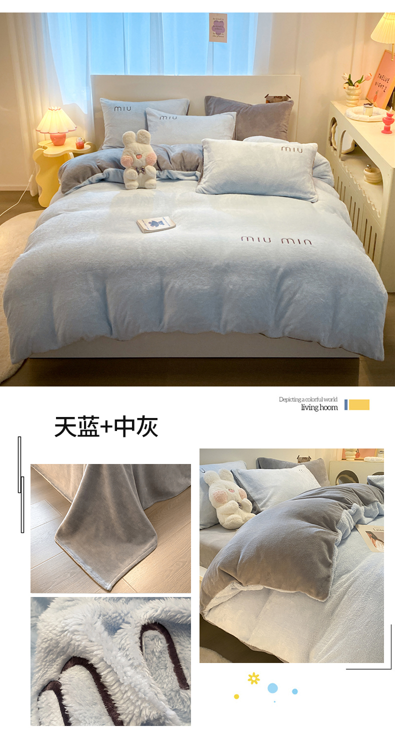 商品名称:启程家纺 2024新款A类加厚北极绒拼牛奶绒字母刺绣四件套 北极绒-天蓝+中灰